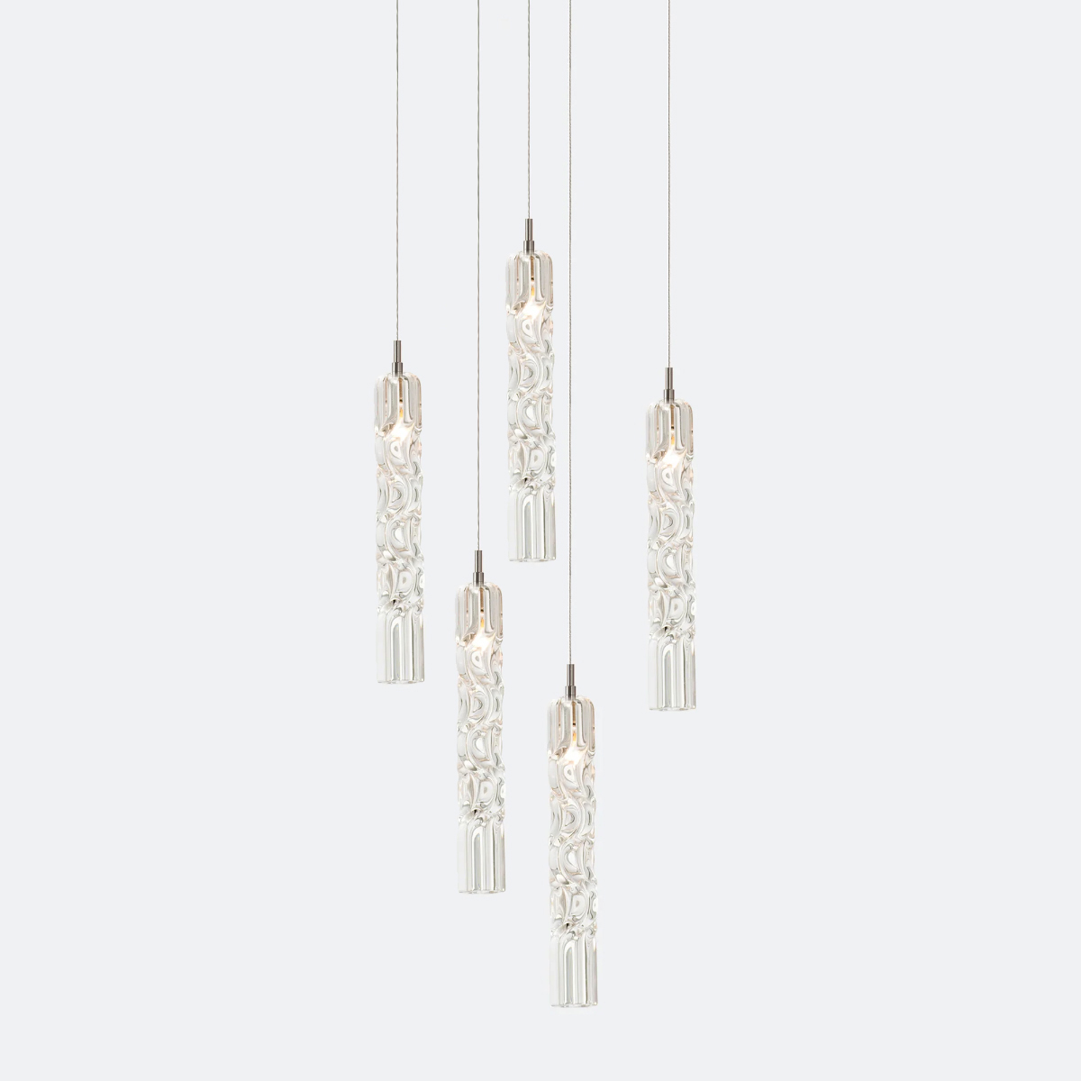 Подвесной светильник Delight Collection OWD272-5 gold с пятью подвесами на круглом основании золотого цвета. Высокие узкие плафоны с узорами на поверхности с выполнены из прозрачного стекла. Диаметр плафона 4,7 см, высота 3