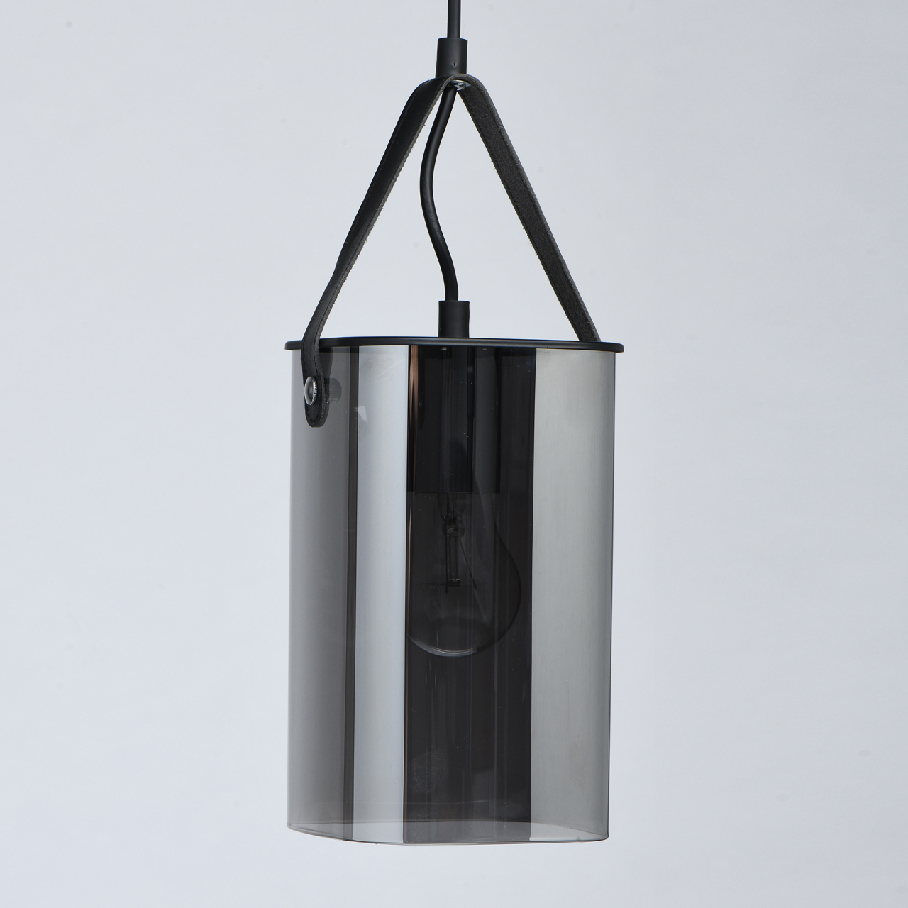 Основание светильника выполнено из металла и окрашено в черный цвет. Стеклянные плафоны гальванизированы в цвет антрацита. Плафоны крепятся к основанию на кожаных ремешках черного цвета.