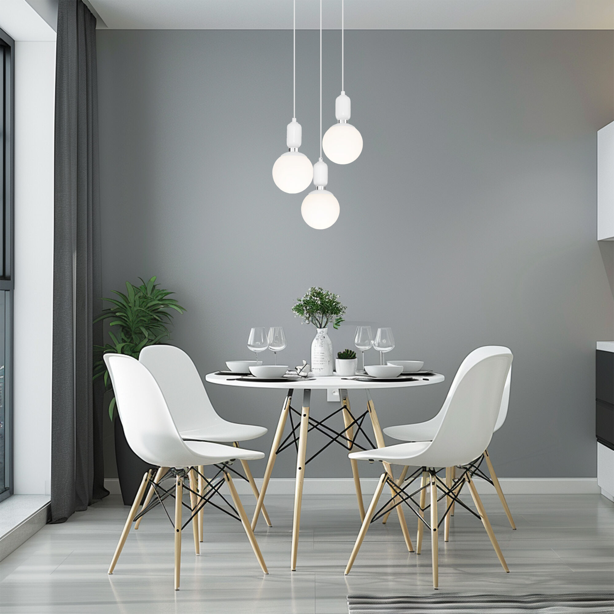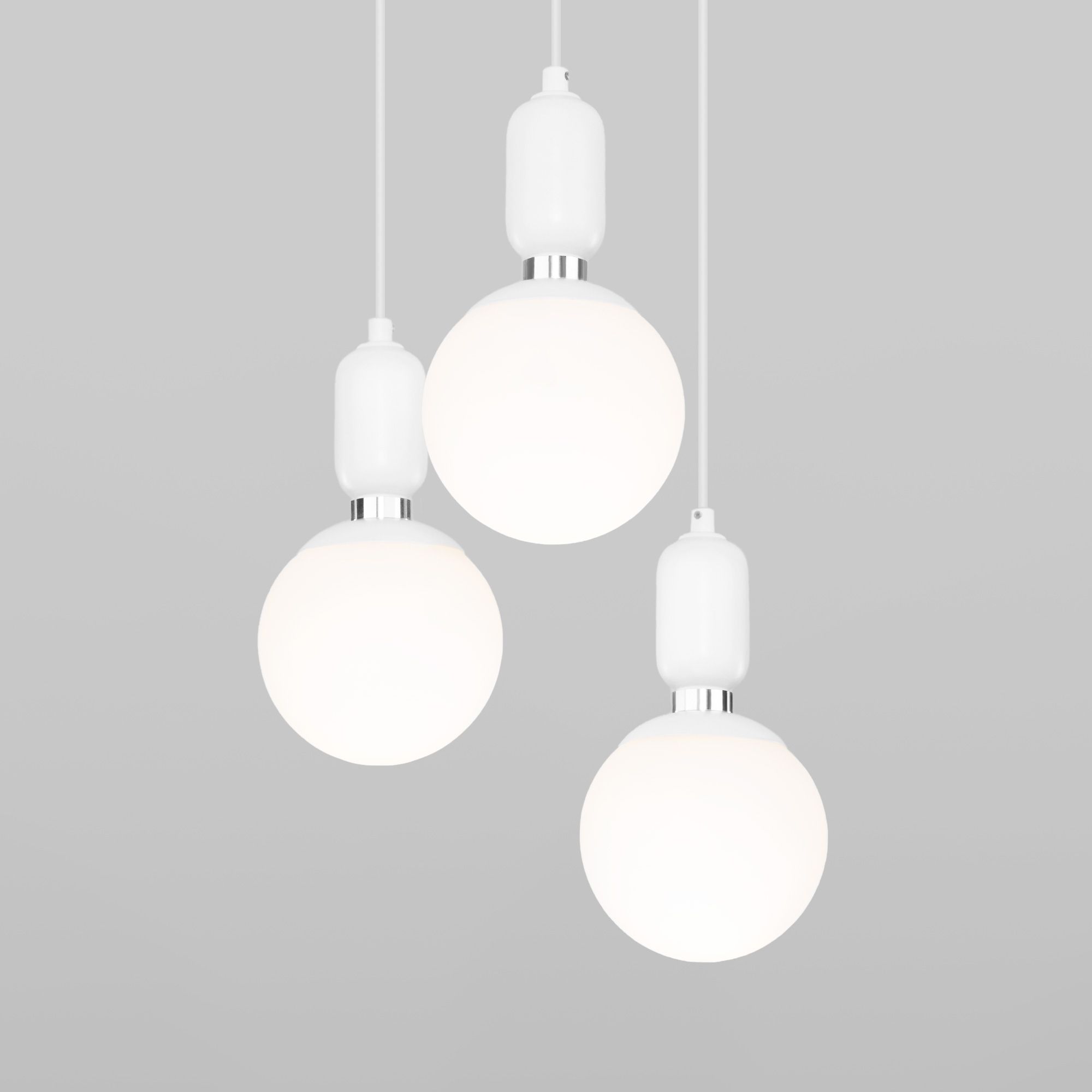 Подвесной светильник со стеклянными плафонами 50151/3 в белом цвете предназначен для создания дополнительного освещения и акцентной подсветки в современных интерьерах. Светильник со сменными лампами E27 создаст качественное освещение на площади 6 м кв. и подсветит рабочие зоны на кухне, в гостиной, в кабинете и в других местах.