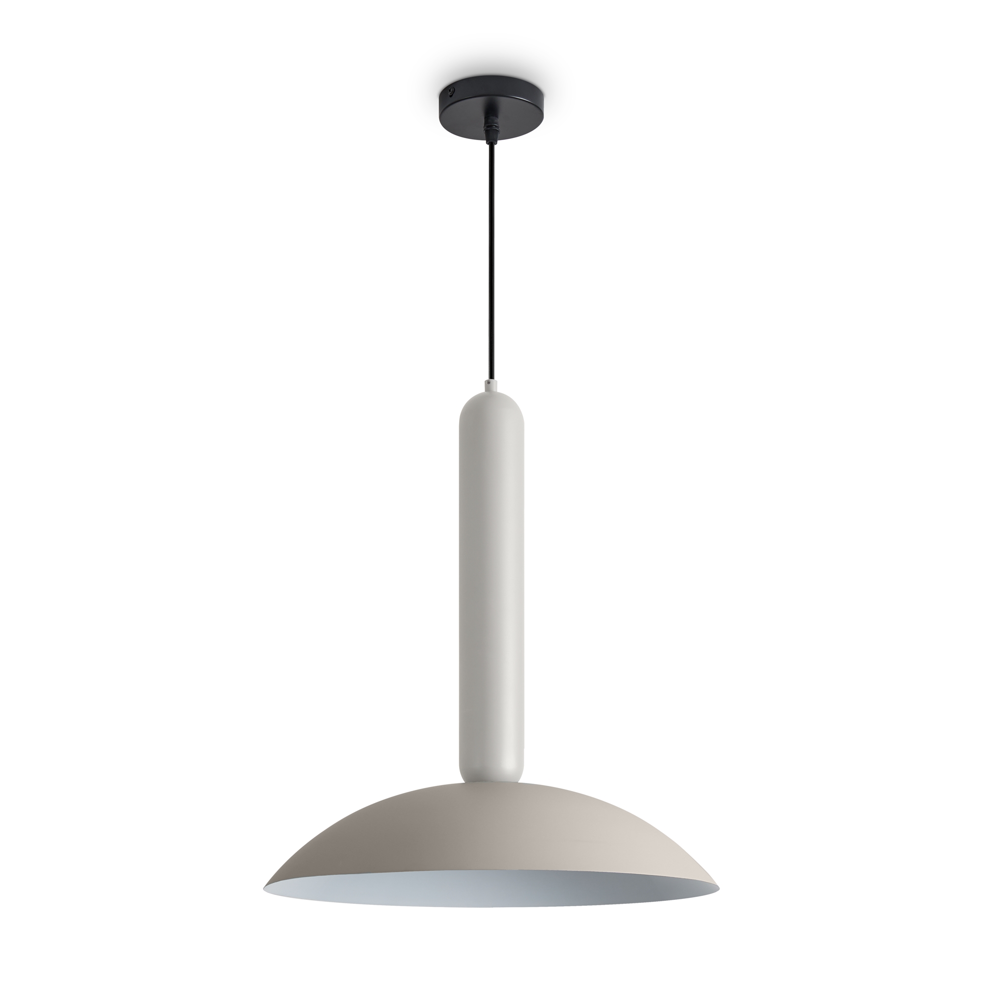 Материал арматуры — металл, цвет — черный. Каждый подвеской светильник окрашен в 2 цвета: серо-бежевый (RAL 1019 ) и жемчужно-белый (RAL 1013), Каменно-серый (7030) и Белый (9010), Белый (9010) и Каменно-серый (7030). Необычный плафон-купол небольшой высоты дополнен подвесом цилиндрической формы. Подходит для современных интерьеров: лофт, джапанди и минимализм. Номер Ral носит рекомендательный характер.