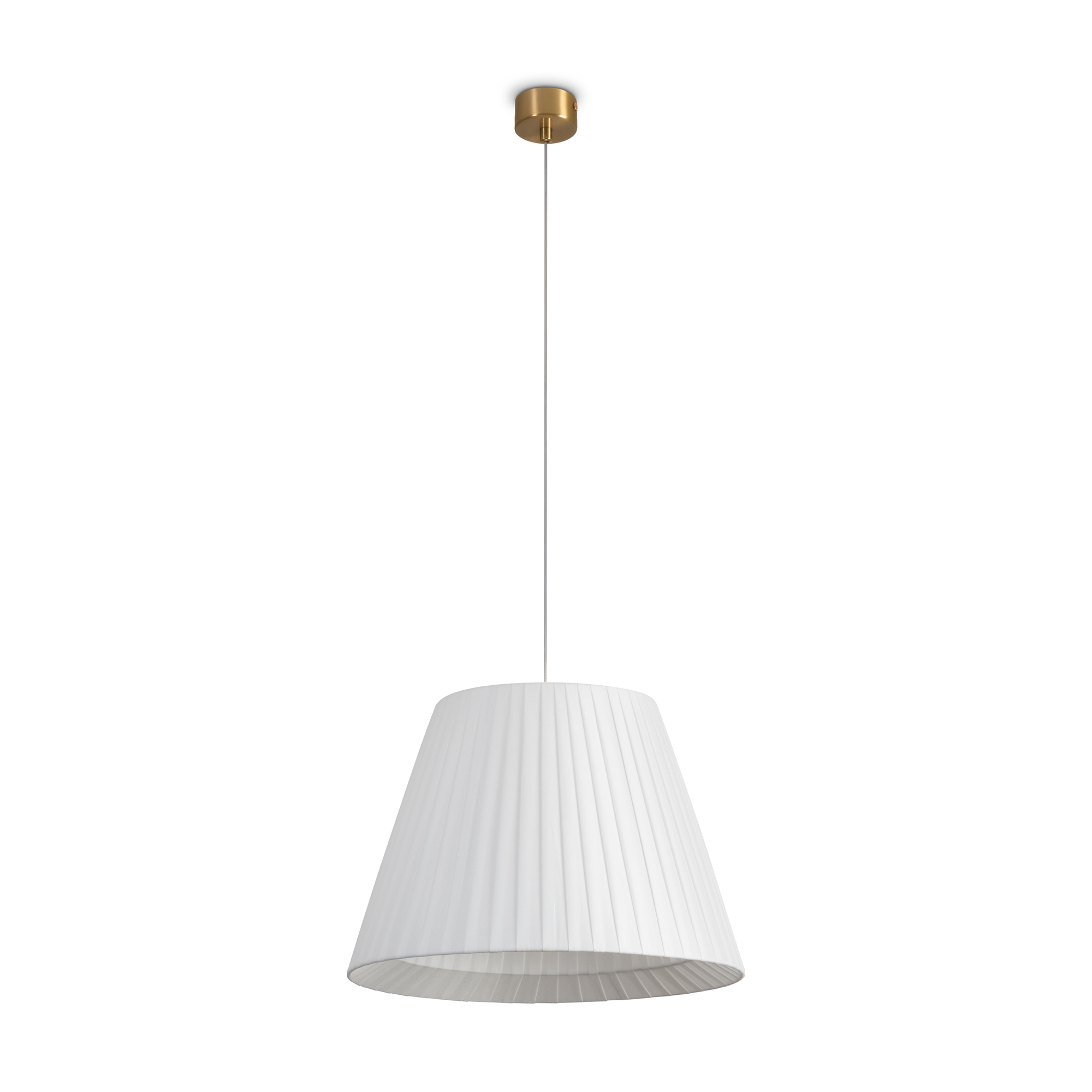 Металлическая арматура в цвете латунь. Подвесные светильники 2-х форм с плессированными абажурами, дополненные рассеивателем. Лампы E27/E14 (не в комплекте) дают мягкий рассеянный свет.