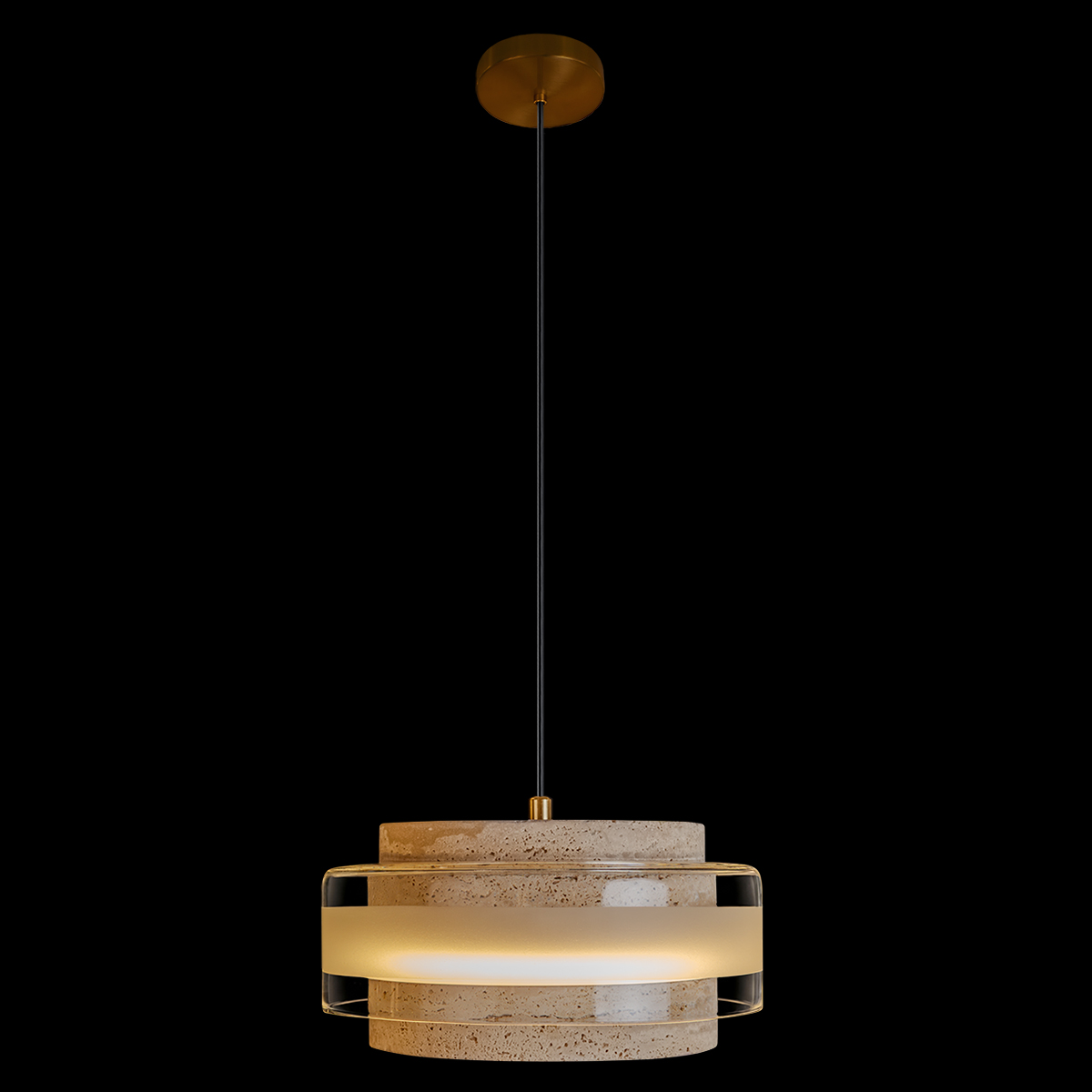 Подвесной светильник, который выглядит как дизайнерский объект, а не просто источник света. Его форма построена на сочетании строгой геометрии и природной фактуры: вытянутый цилиндр из светлого камня напоминает отполированный кусок тёплого известняка или травертина, с естественными точечными вкраплениями и мягким, чуть бархатистым оттенком.