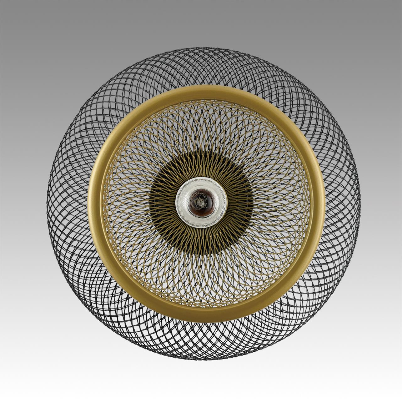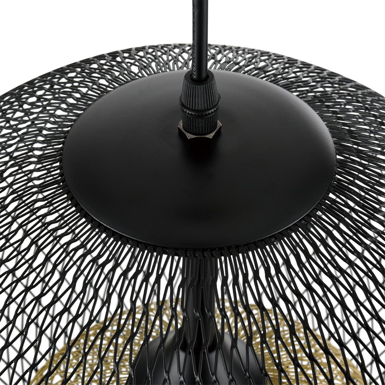 Подвесной светильник LEONELA в стиле лофт интересен двойным плафоном из сетки: черный снаружи и золотой внутри. Блеск желтого металла усиливается от света включенной лампы, при этом черная вуаль второго большого полукруглого абажура усмиряет и приглушает излишнюю яркость позолоты. Металлический полупрозрачный абажур не сильно скрадывает свет, наполняя комнату уютным освещением.