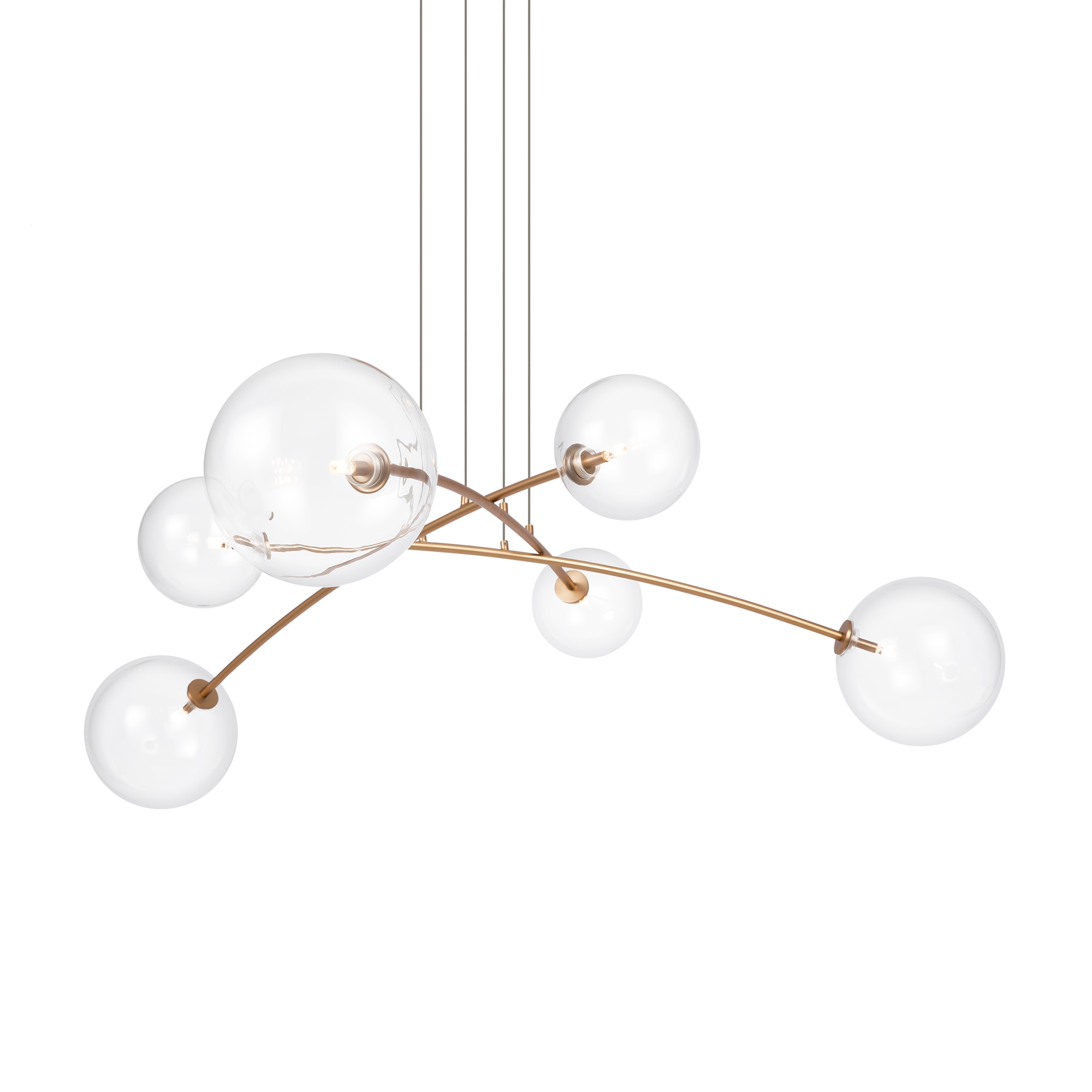 Материал арматуры - металл. Цвет - латунь, черный. Изящные линии арматуры, прозрачные плафоны из стекла в виде шара с миниатюрными лампами создают эффект воздушности светильников. Регулируемая высота подвесных светильников. Цоколь G4.