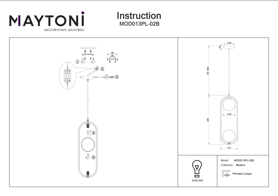 Подвесной светильник Maytoni Ring MOD013PL-02B, входящая в коллекцию Modern, отлично подойдет для освещения пространства в гостиной, на кухне, на даче, в кабинете, в прихожей, оформленных в современном стиле или в стиле Хай-тек. Данный артикул имеет два плафона белого цвета в форме шара диаметром 12 см, выполненных из стекла и направленных вверх и вниз, а также матовую черную арматуру, изготовленную из металла. Немецкий производитель Maytoni дает гарантию на свое изделие 2 года и рекомендует использовать для устройства энергосберегающие лампы с цоколем G9 и мощностью 25 Вт каждая, при этом общая мощность светильника равна 50 ВТ, что позволяет осветить помещение площадью 2 кв. м. Технической особенностью этого осветительного прибора является возможность регулирования по высоте, при этом максимальная высота светильника составляет 204 см. Способ крепления светильника к потолку на планку позволяет быстро и просто осуществить монтаж, при этом подходит для всех типов потолков, в том числе и натяжных. Стильный дизайн, тип подвеса на трос и матовая поверхность подвесного светильника Maytoni Ring MOD013PL-02B делают его особенным элементом декора, который украсит любое интерьерное пространство.