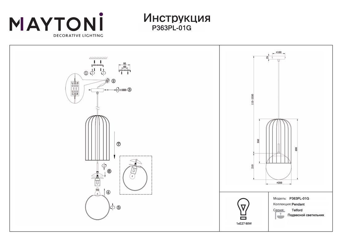 Подвесной светильник Maytoni Telford P363PL-01G в Ялте