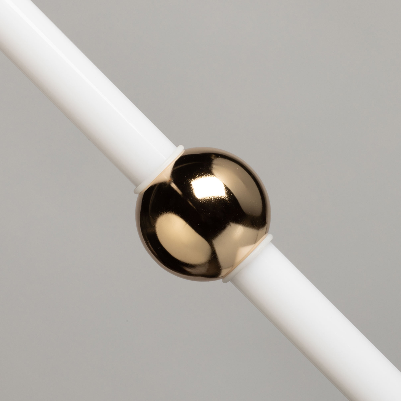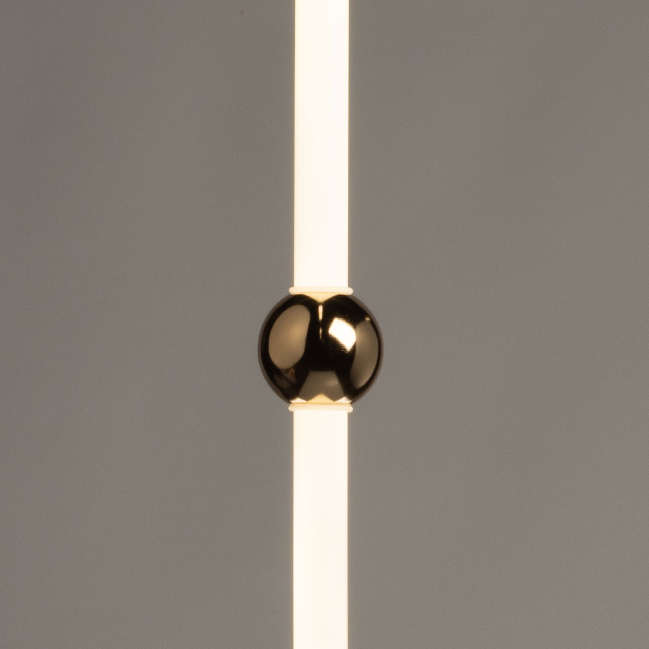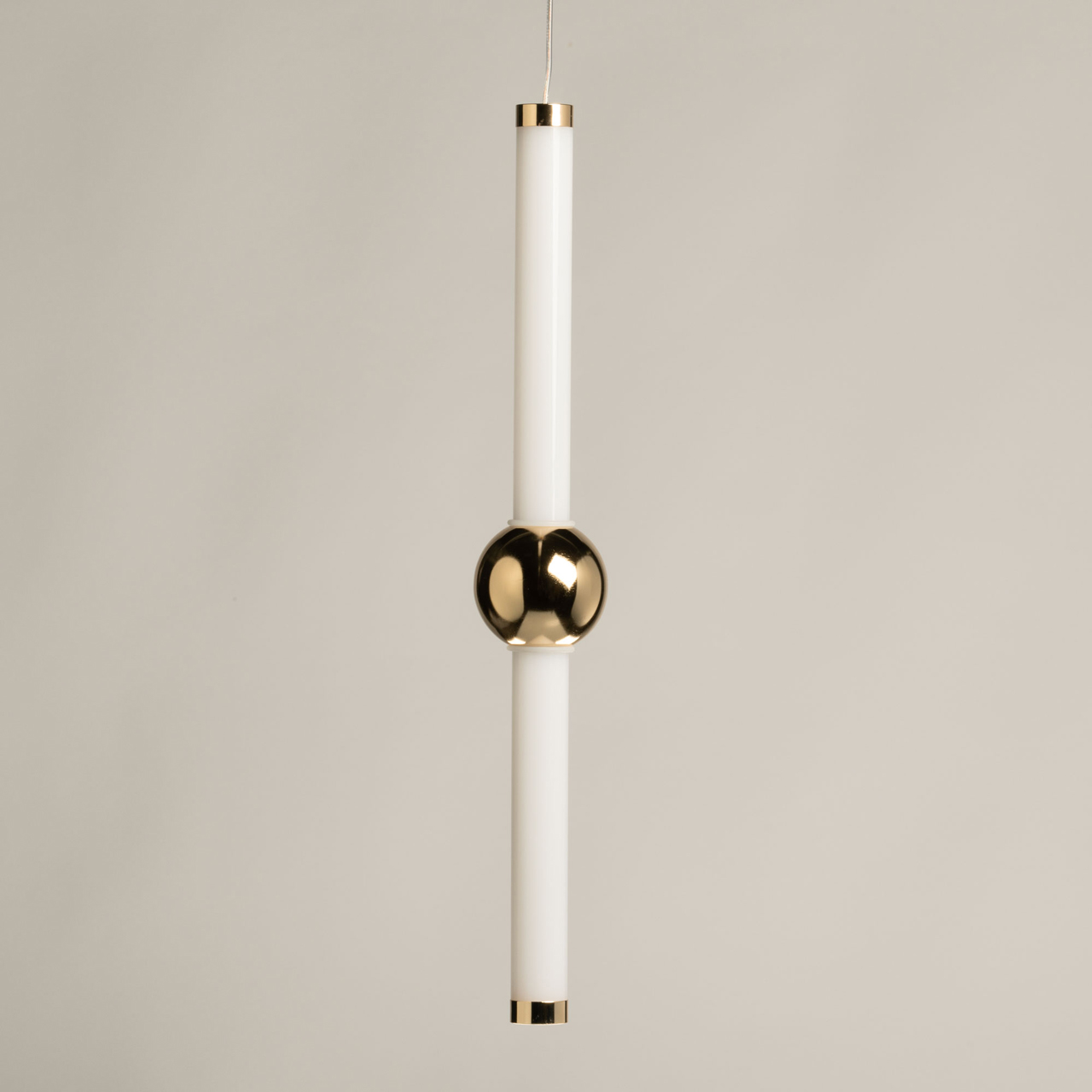 Металлическое основание подвеса гальванизировано в цвет золота. Светодиодный источник света закрыт белым матовым акрилом. Декорирован металлическим шаром золотого цвета.