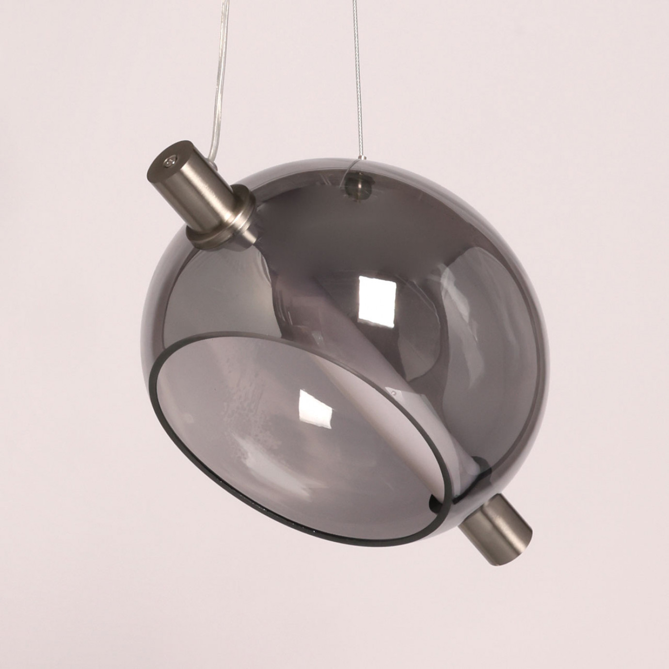 Металлическое основание подвеса гальванизировано в цвет никеля. Светодиодный источник света закрыт акрилом белого цвета. Подвес декорирован оригинальным плафоном из стекла, гальванизированного в дымчатый цвет.. Декоративный металлический держатель плафона гальванизирован в цвет основания.