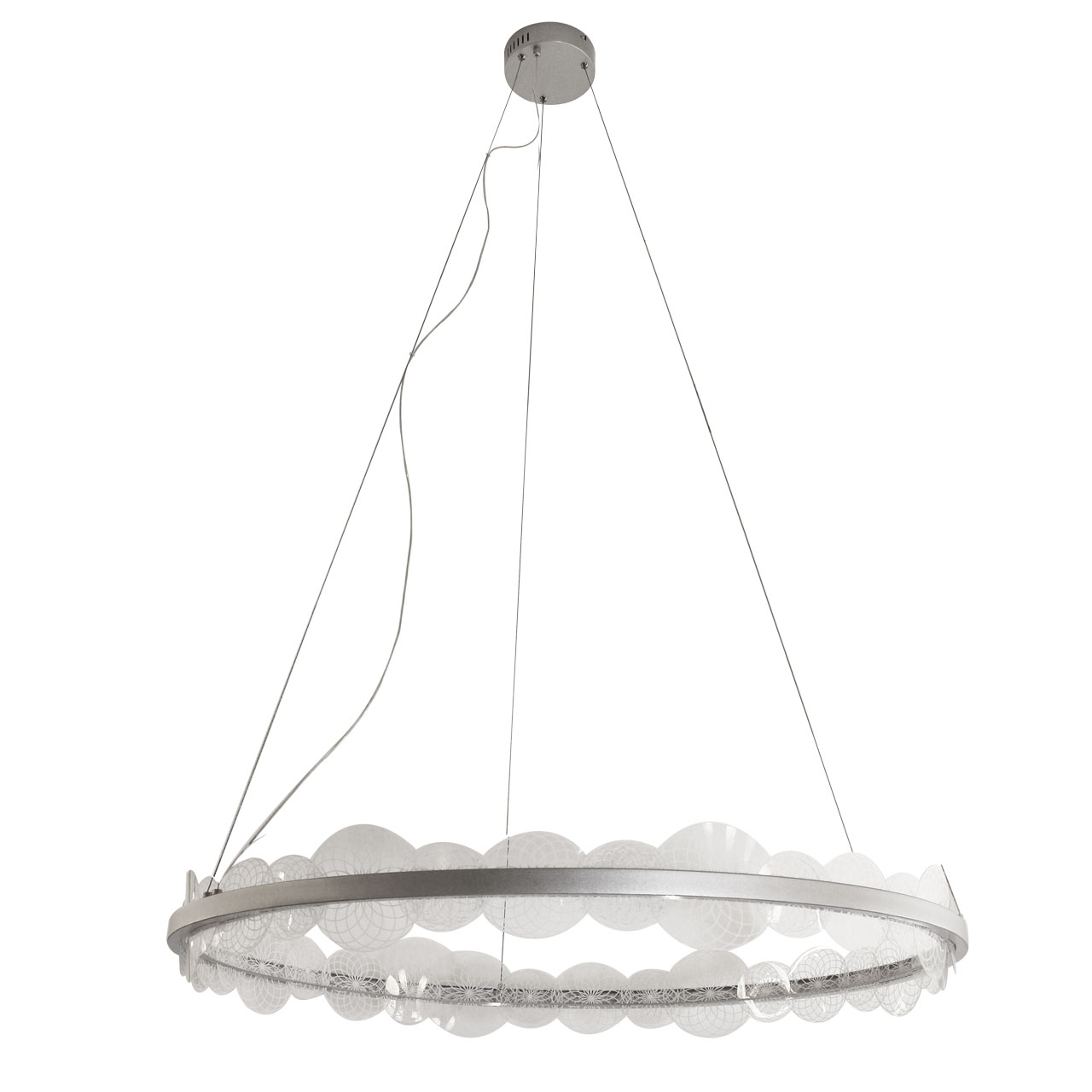 Металлическое основание подвесной люстры окрашено в цвет матового серебра. Корпус плафона выполнен из сплава алюминия и окрашен в цвет основания. Плафон декорирован прозрачным акрилом с геометричным фактурным рисунком.