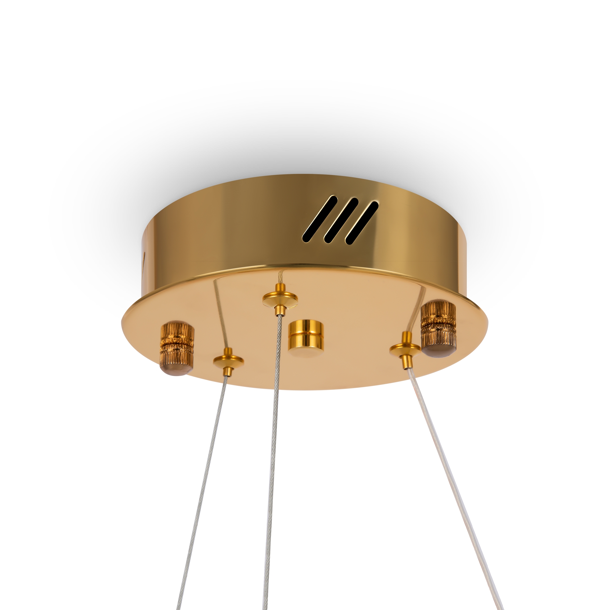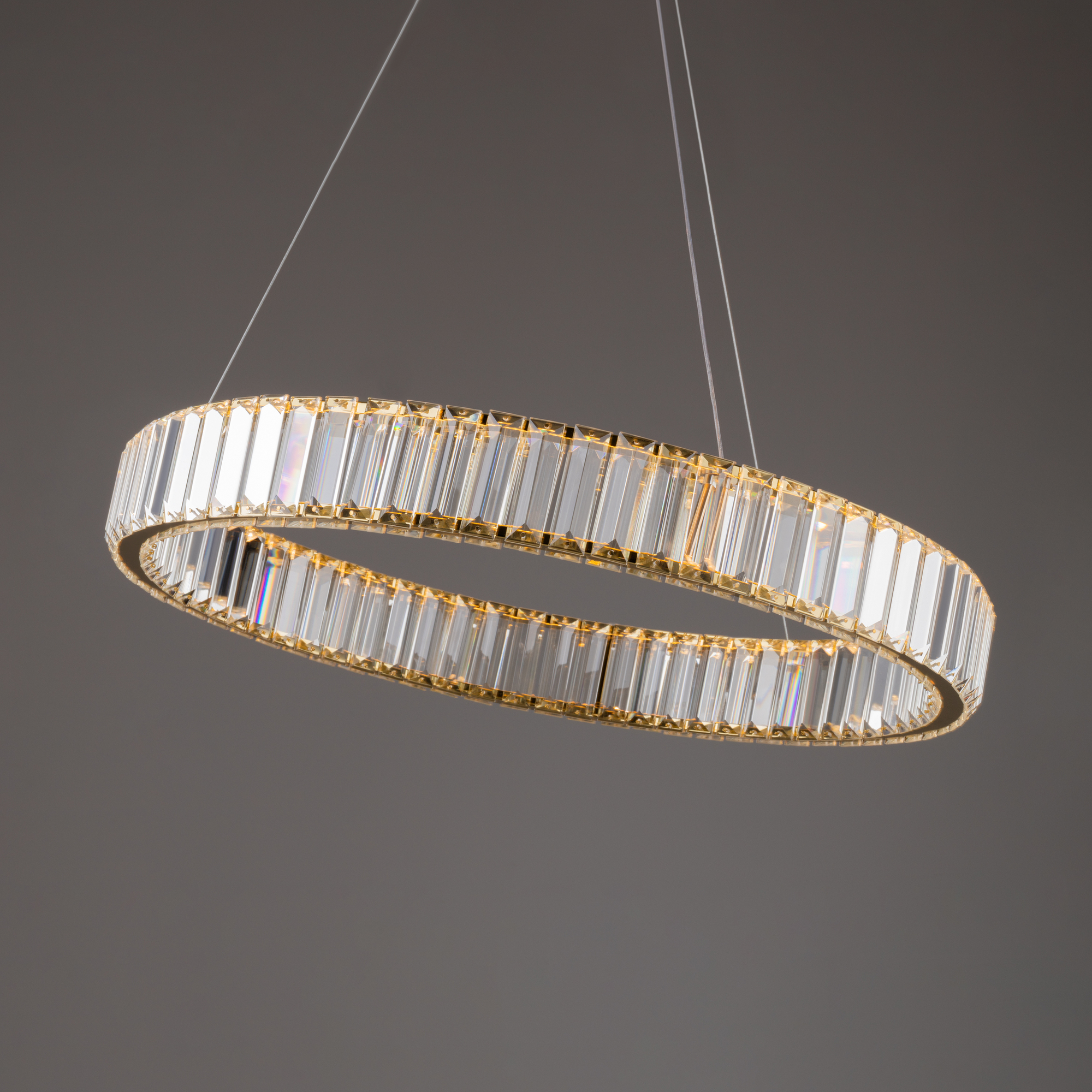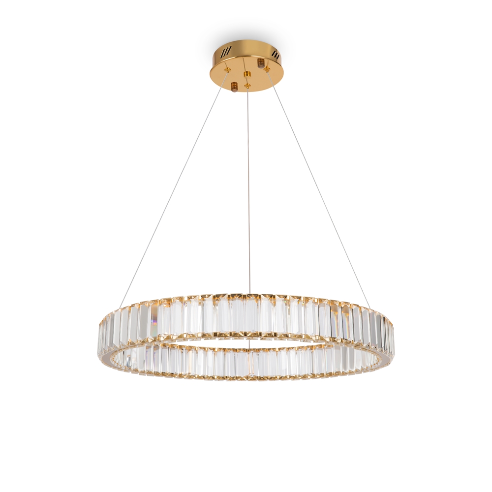 Металлическая арматура в цвете латунь и хром. Хрустальные декоративные кольца с геометричными гранями. LED-источник света. Регулировка цветовой температуры (3000-4000-5000K) и яркости 4G-dimming при помощи пульта (в комплекте).