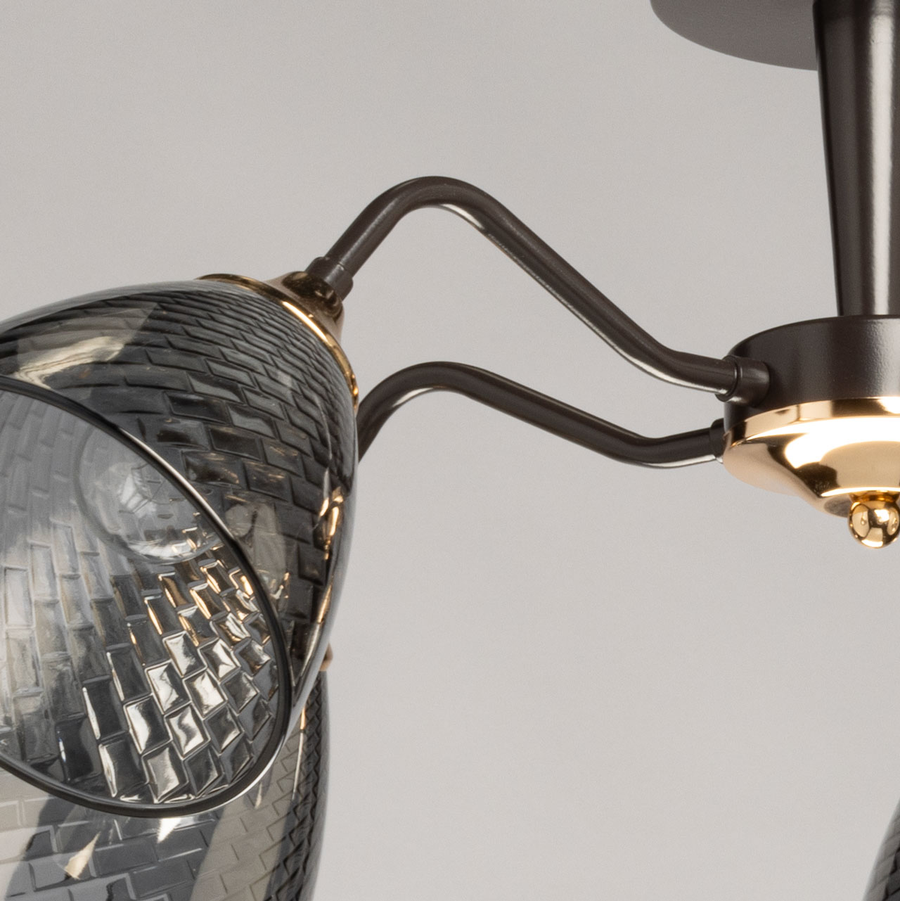 Основание светильника выполнено из металла и окрашено в цвет кофе. Отдельные элементы основания гальванизированы в цвет золота. Стеклянные плафоны отлиты в сложную форму с внутренней текстурой и гальванизированы в дымчатый цвет.