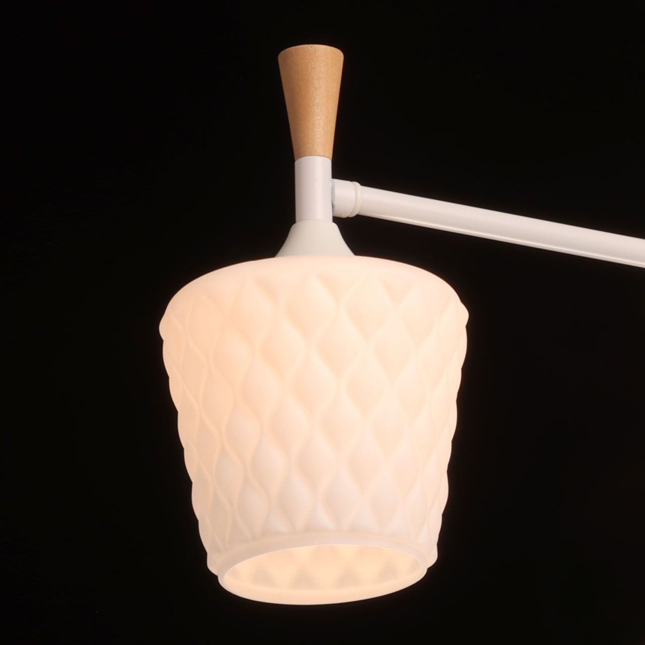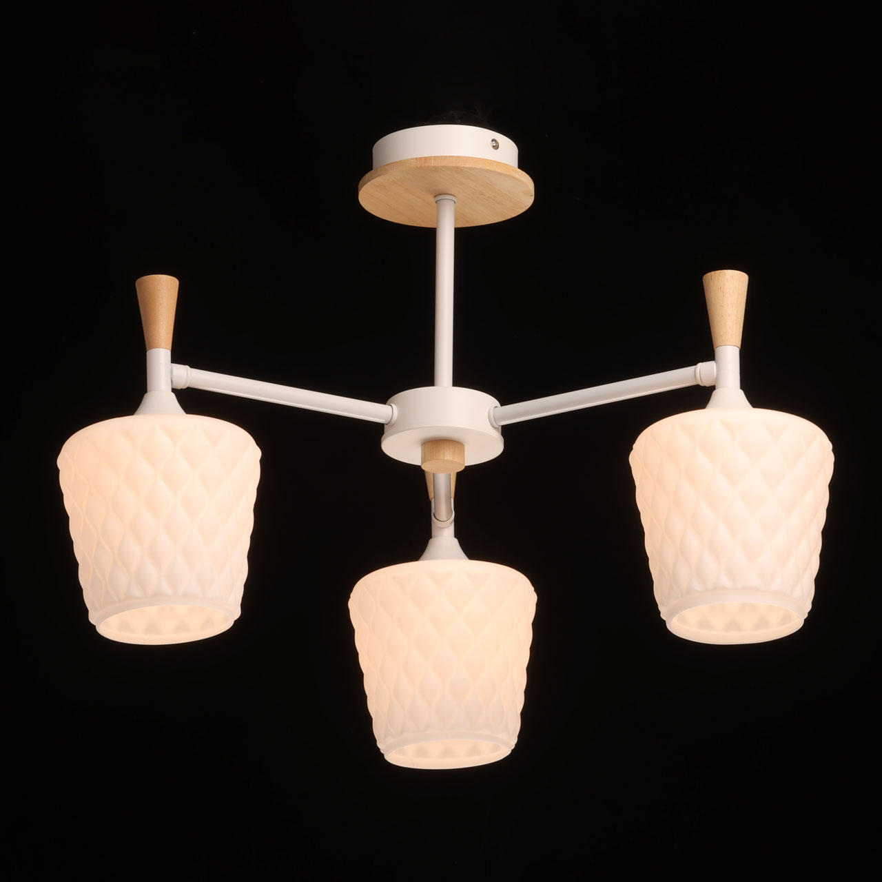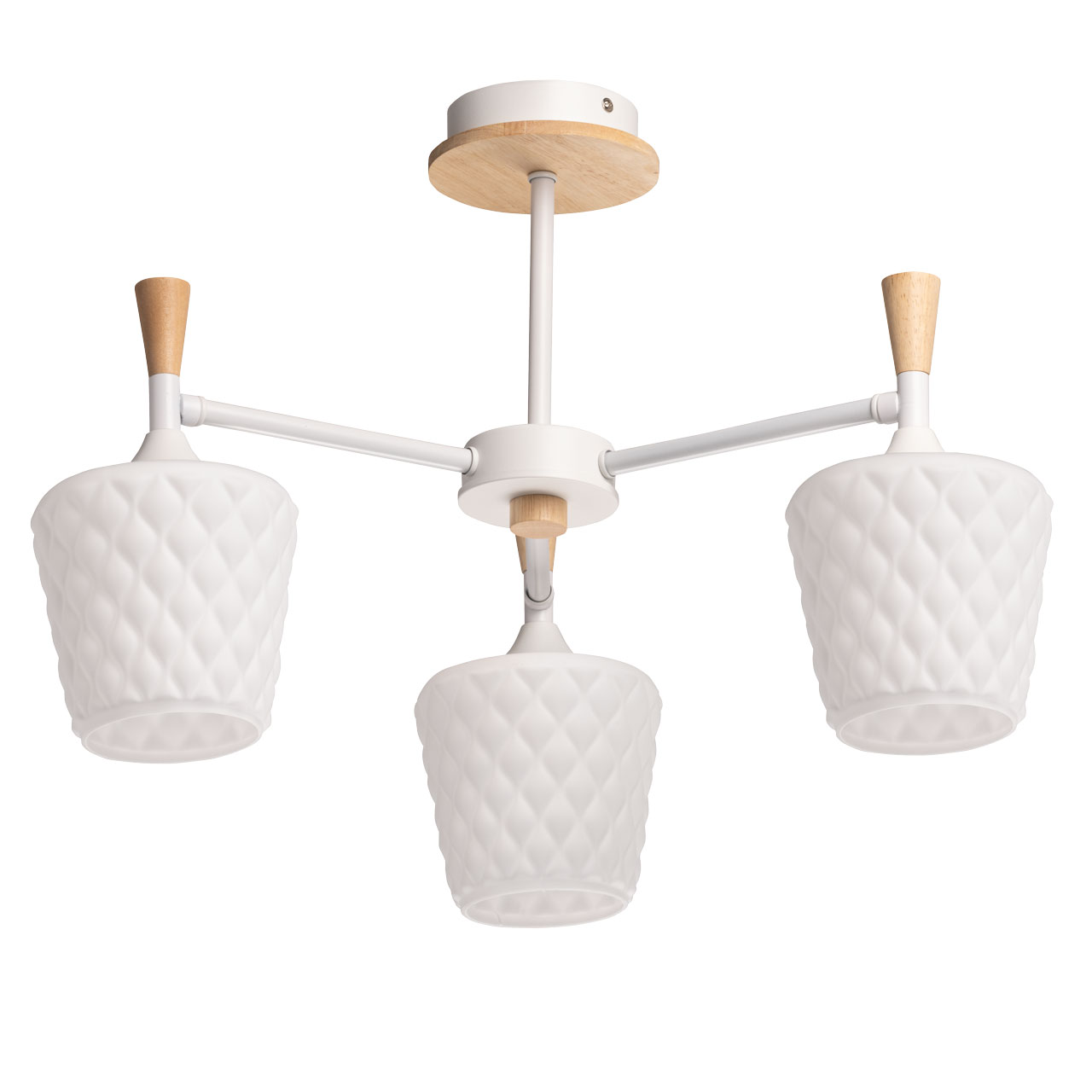 Металлическое основание потолочной люстры окрашено в белый цвет. Фактурные стеклянные плафоны окрашены в белый цвет. Потолочная люстра декорирована элементами из светлого натурального дерева.