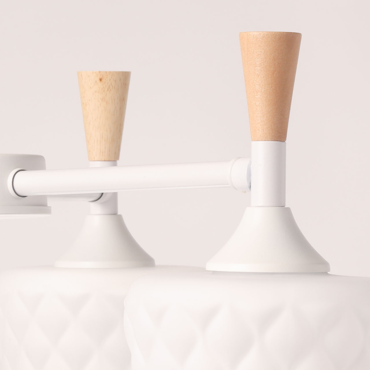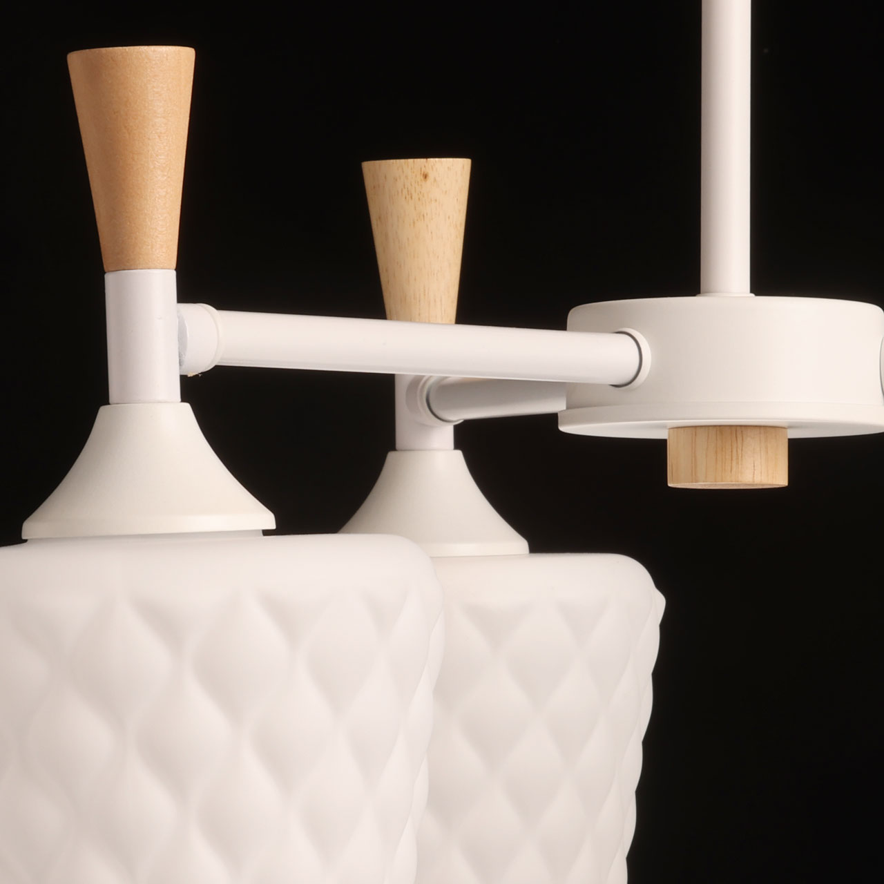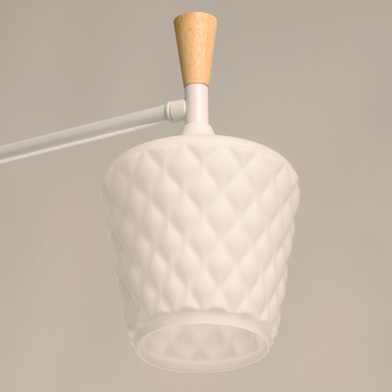 Металлическое основание потолочной люстры окрашено в белый цвет. Фактурные стеклянные плафоны окрашены в белый цвет. Потолочная люстра декорирована элементами из светлого натурального дерева.