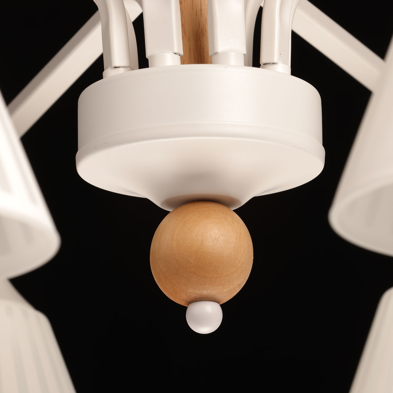 Металлическое основание потолочной люстры окрашено в белый цвет. Стеклянные плафоны окрашены в белый цвет. Люстра декорирована элементами из светлого натурального дерева.