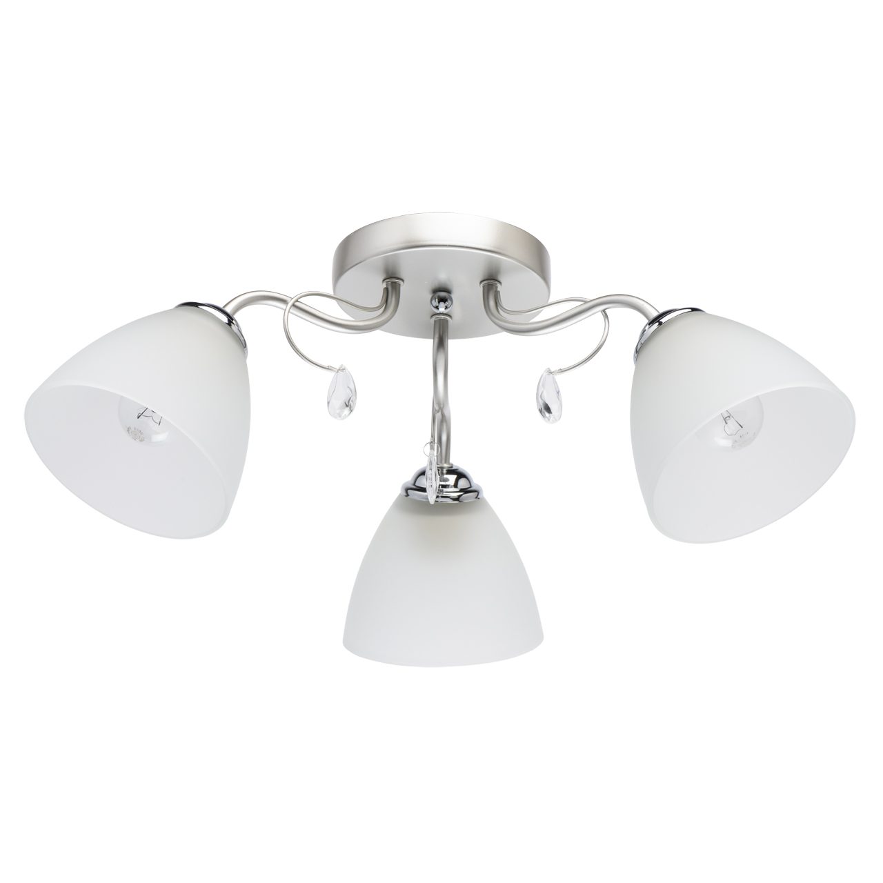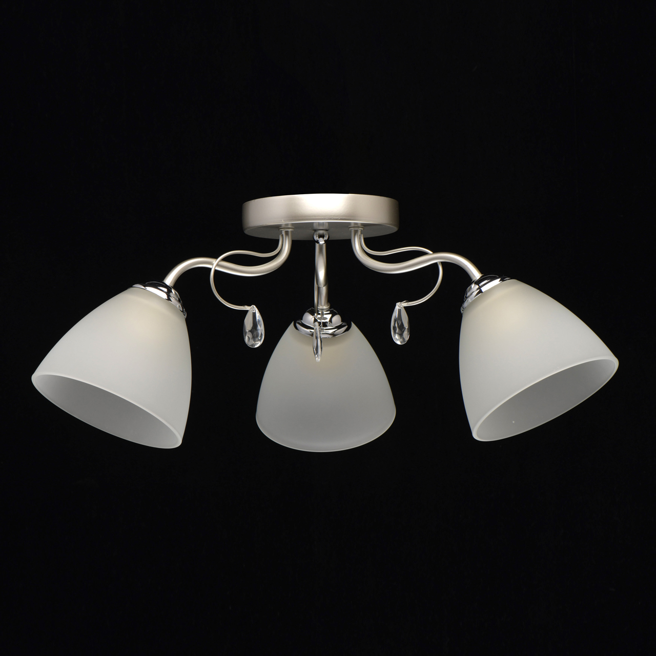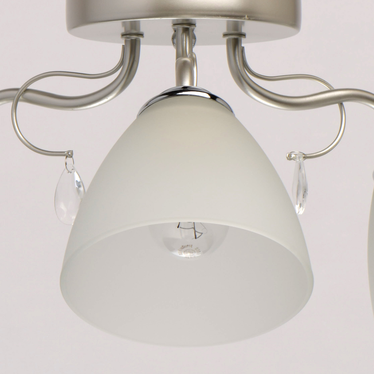 Основание светильника выполнено из металла и окрашено в цвет перламутрового серебра. Держатели плафонов гальванизированы в цвет хрома. Плафоны из матированного стекла. Светильник декорирован подвесками из стекла.