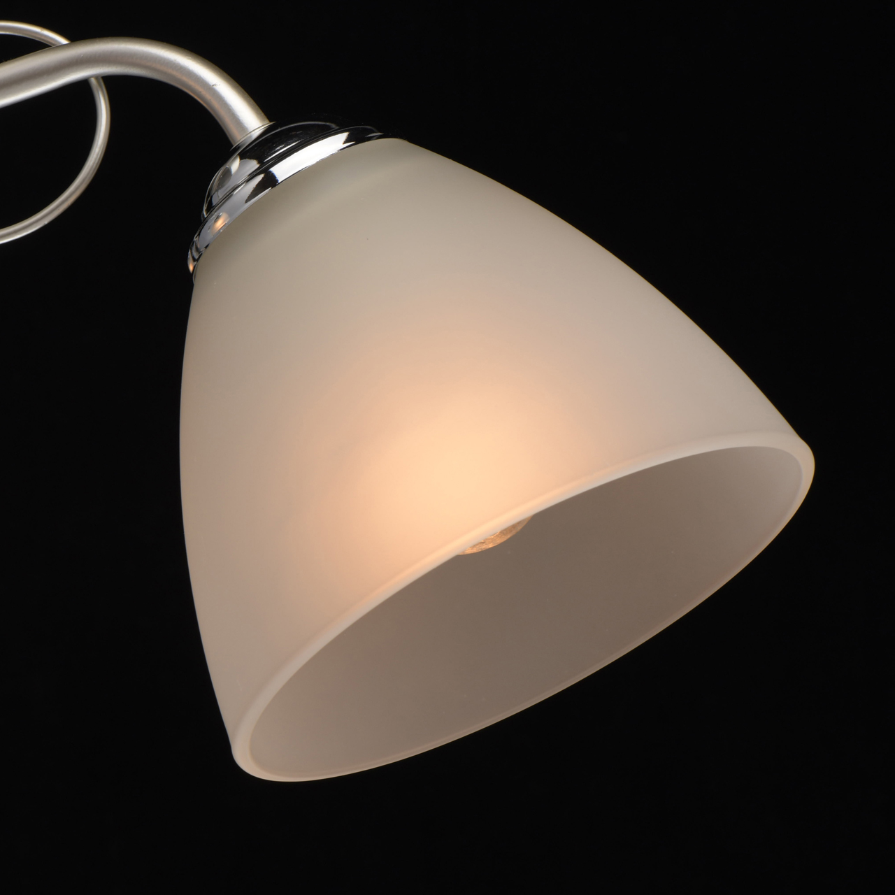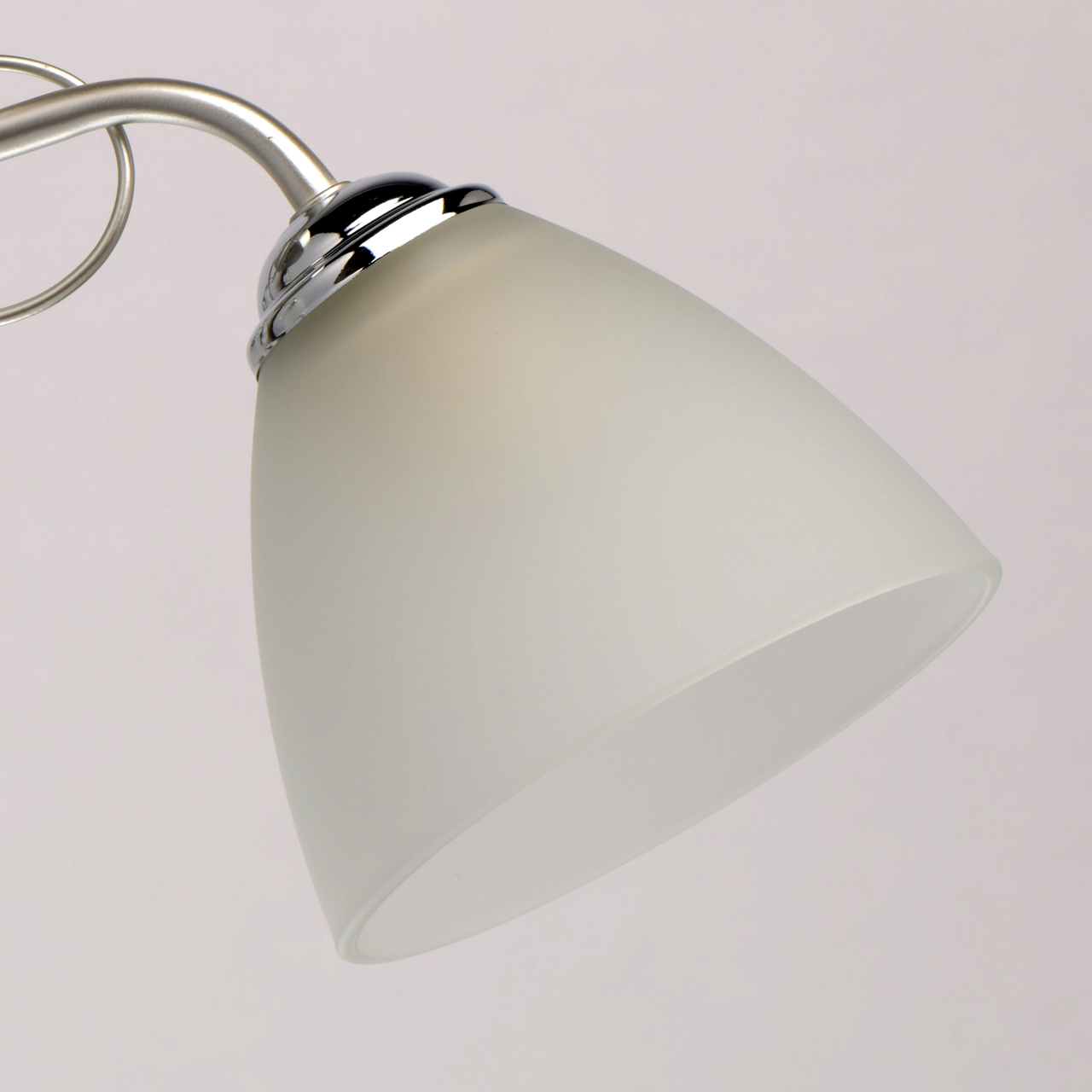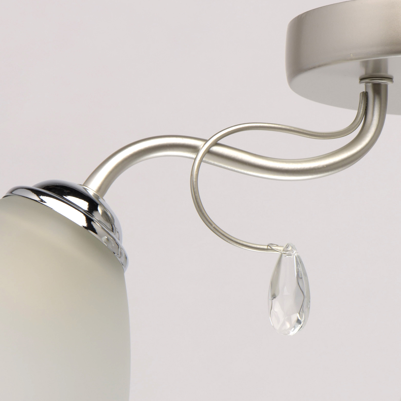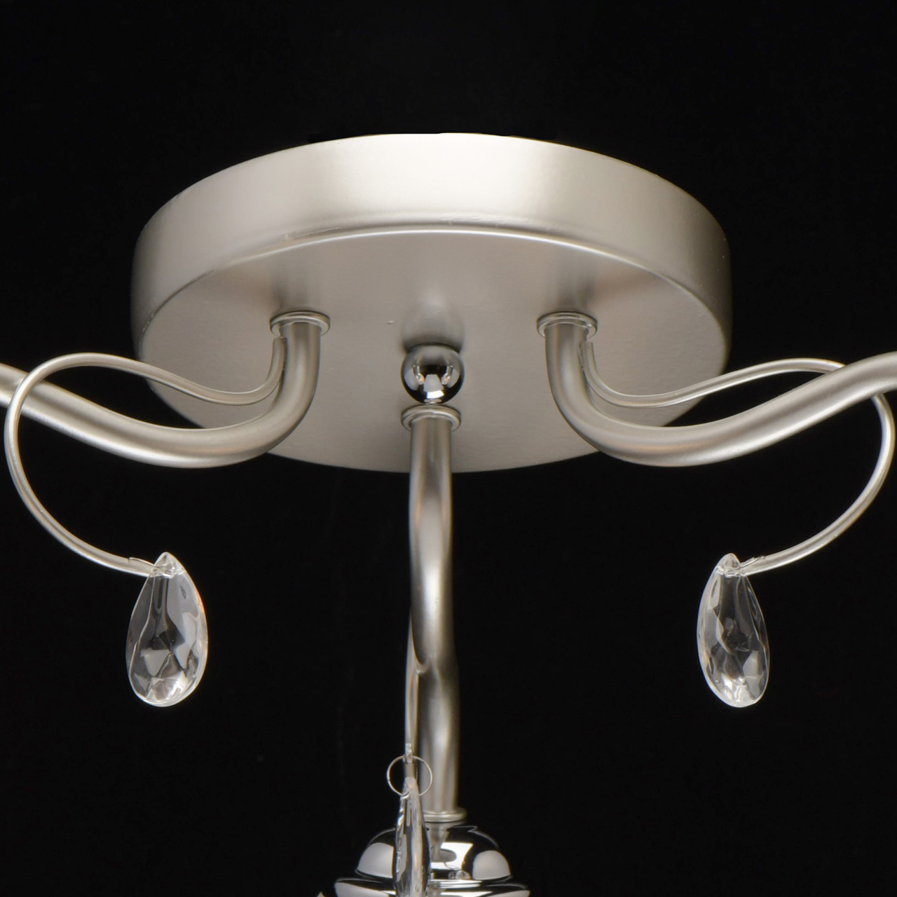 Основание светильника выполнено из металла и окрашено в цвет перламутрового серебра. Держатели плафонов гальванизированы в цвет хрома. Плафоны из матированного стекла. Светильник декорирован подвесками из стекла.