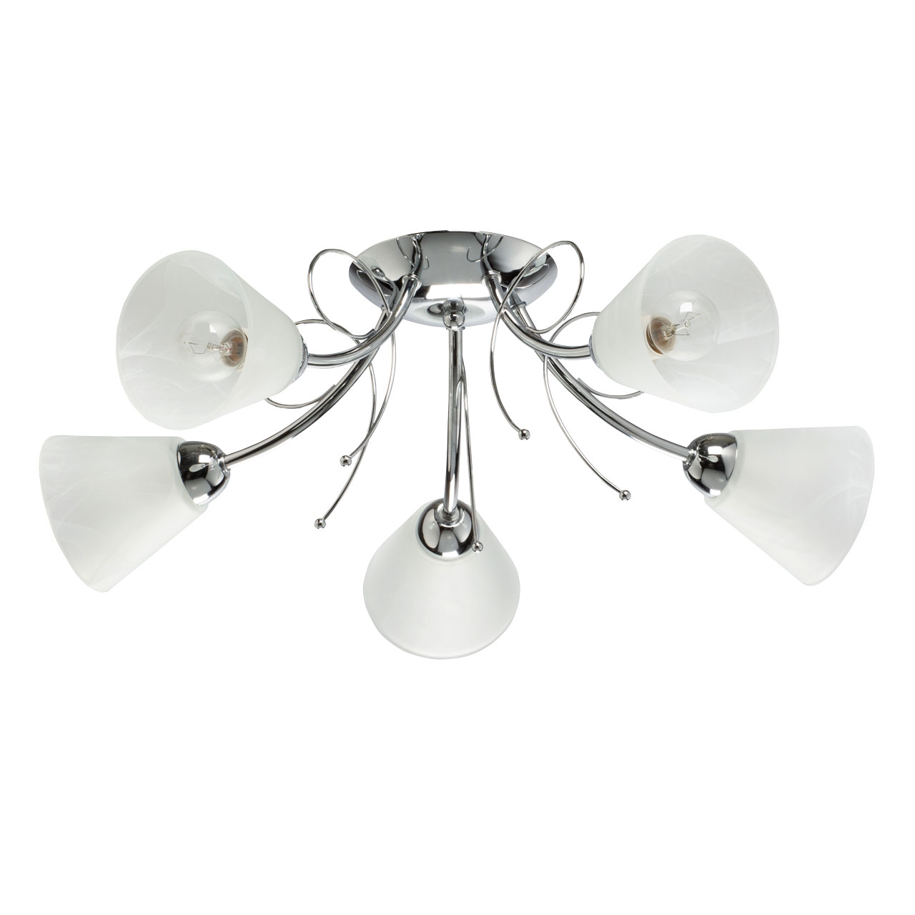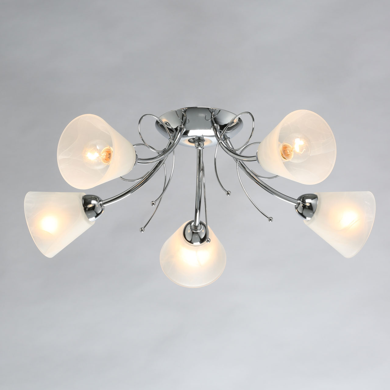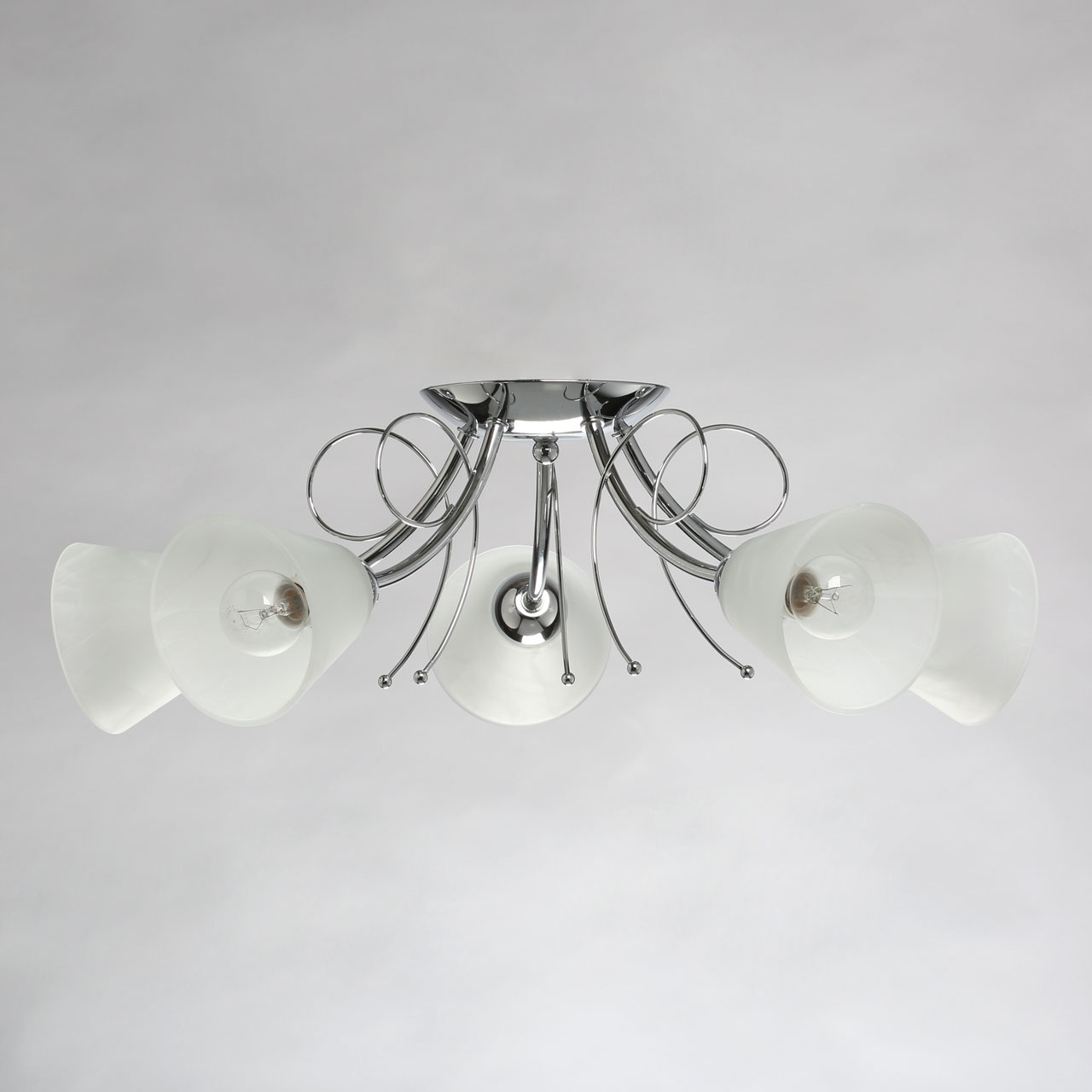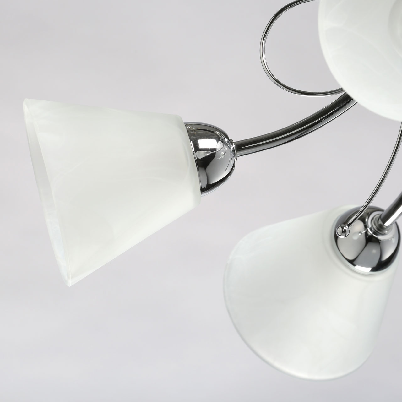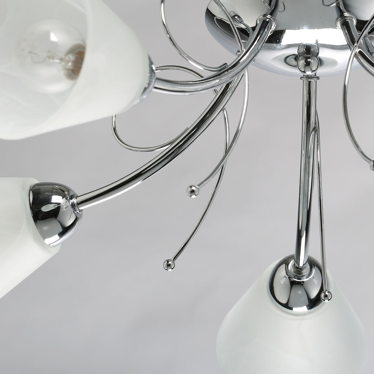 Металлическое основание светильника гальванизировано в цвет хрома. Светильник декорирован плафонами из алебастрового стекла.