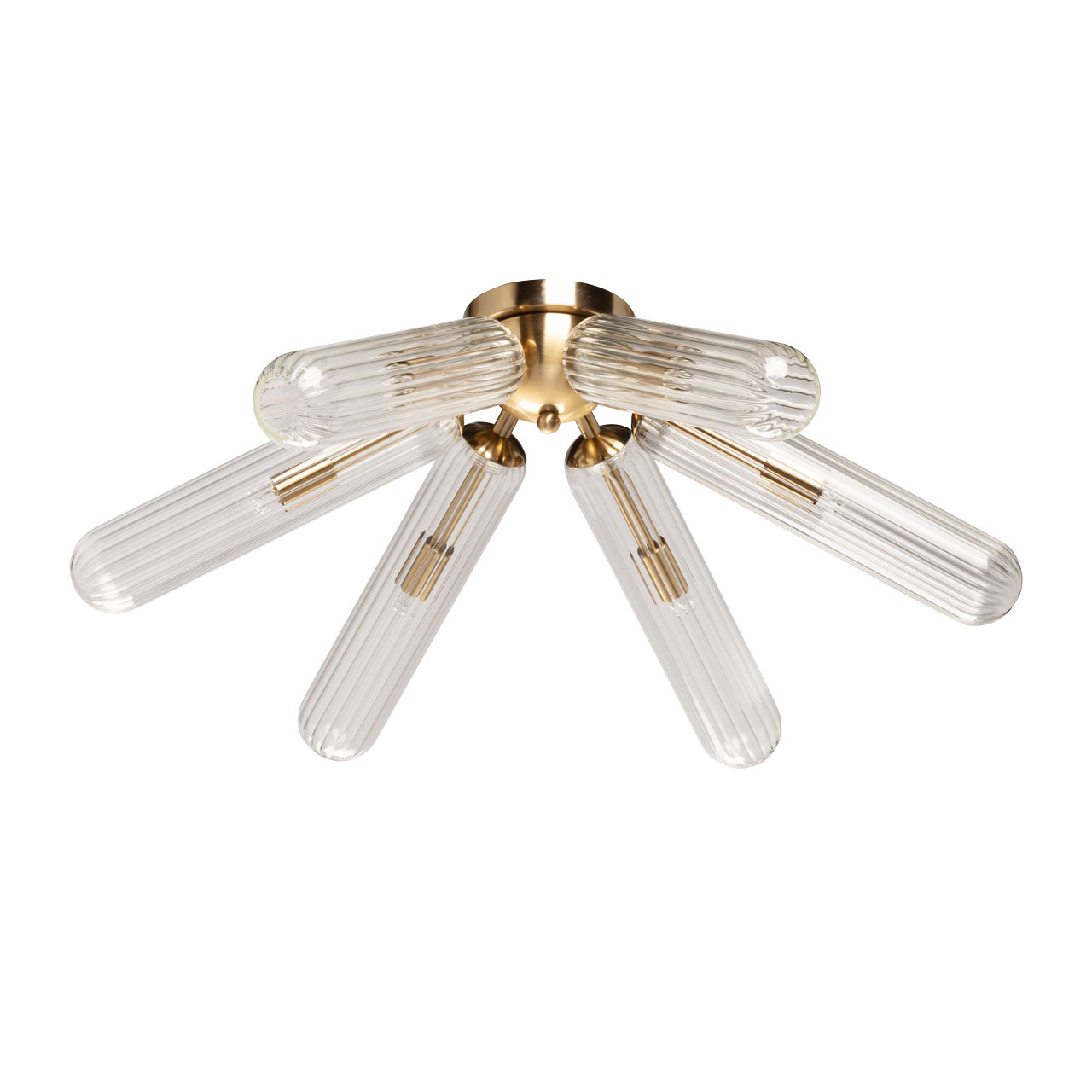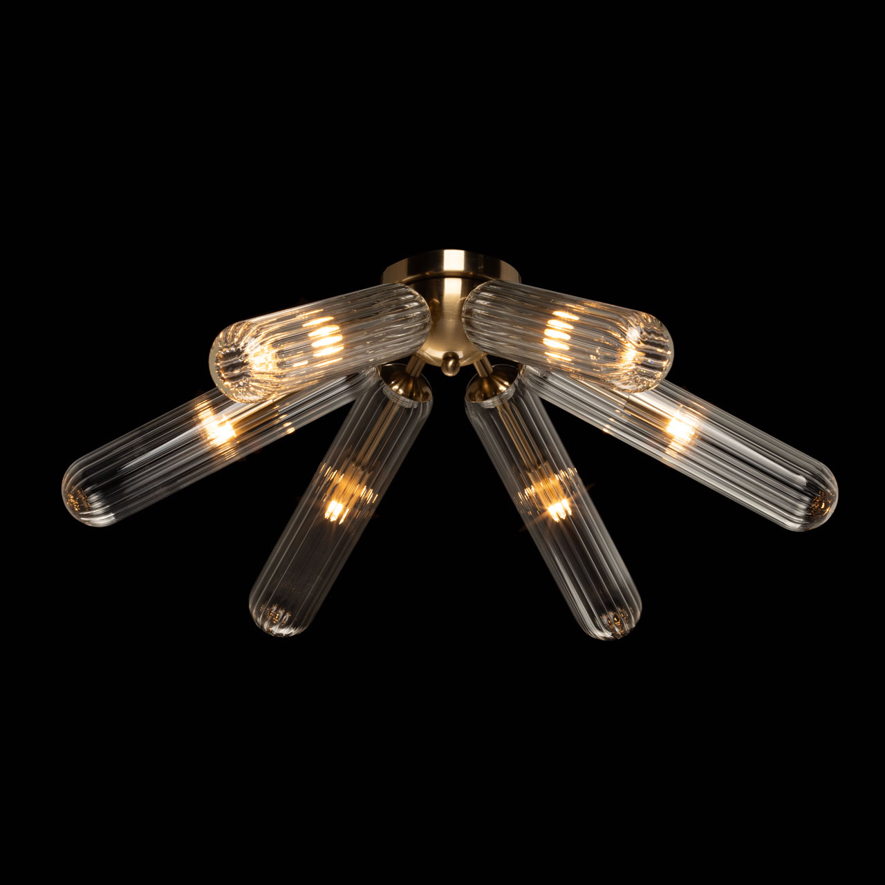 Металлическое основание гальванизировано в цвет медовой бронзы. Рельефные стеклянные плафоны с линейной текстурой отлиты в сложную форму.