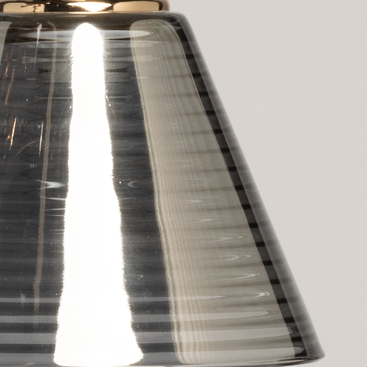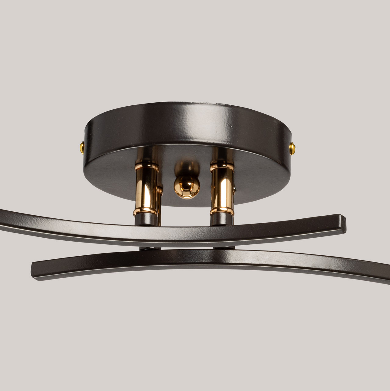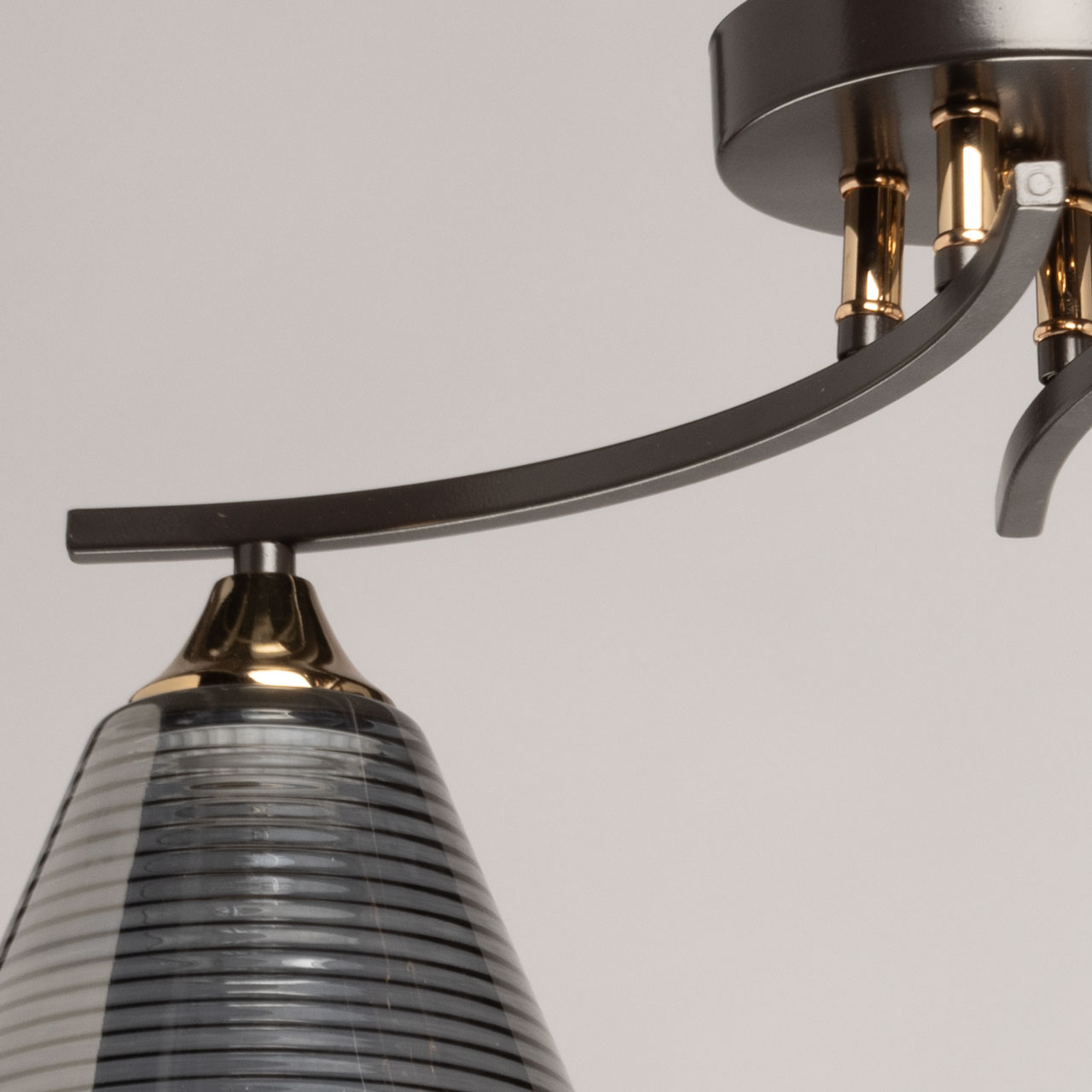 Основание светильника выполнено из металла и окрашено в цвет кофе. Отдельные элементы основания гальванизированы в цвет золота. Стеклянные плафоны отлиты в сложную форму с внутренней текстурой и гальванизированы в дымчатый цвет.