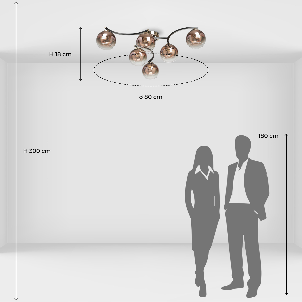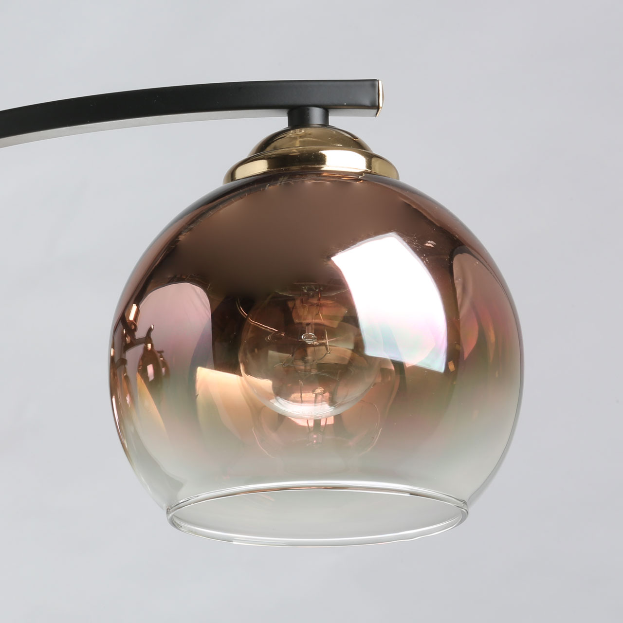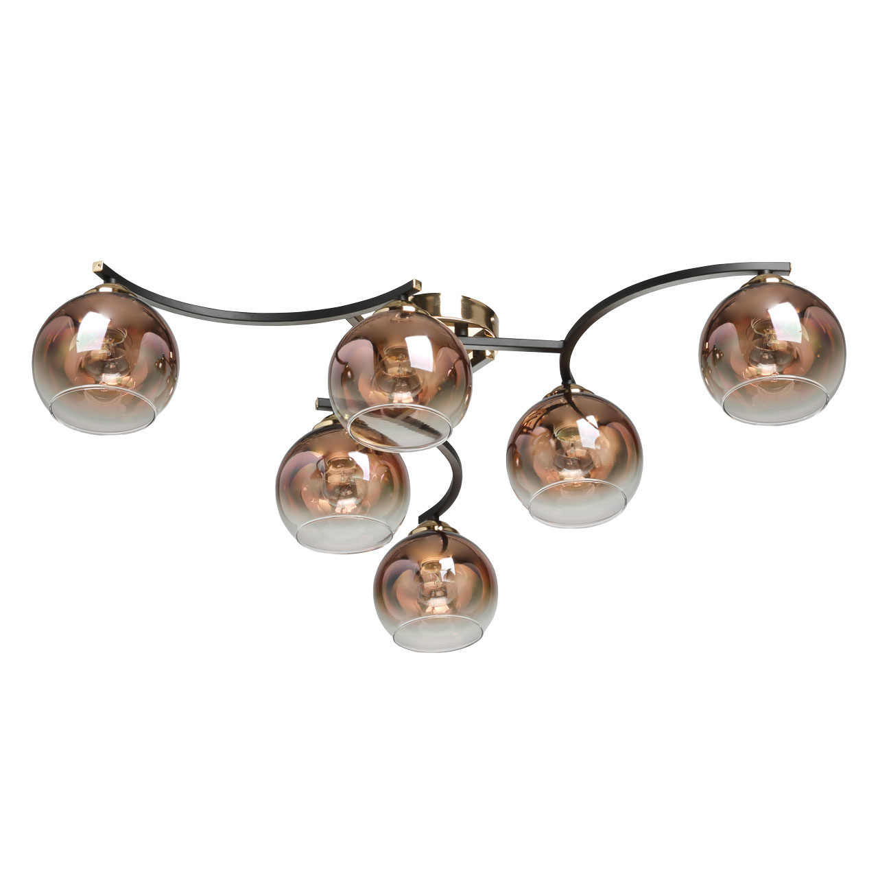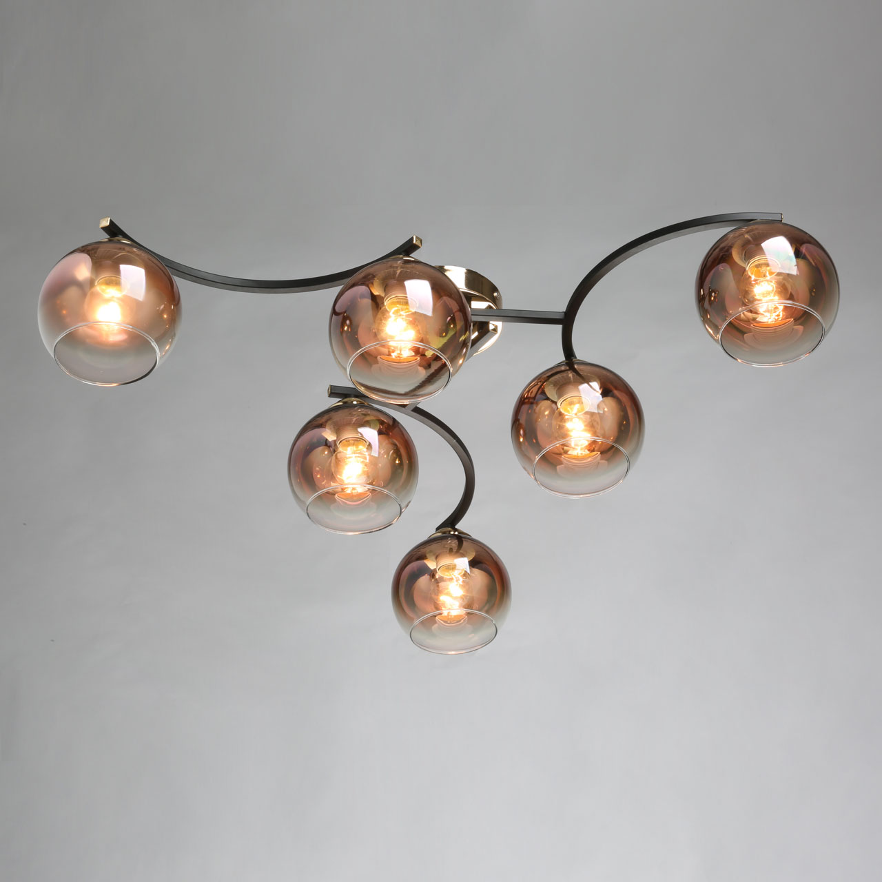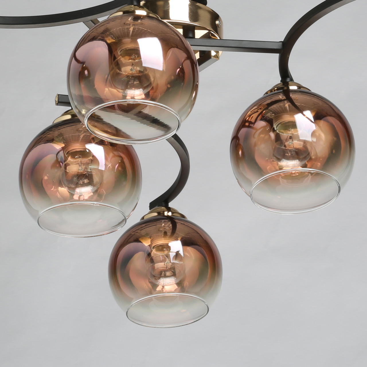 Металлическое основание потолочного светильника окрашено в черный цвет. Отдельные элементы гальванизированы в цвет бронзы. Стеклянные плафоны выдувные в форму градиентно гальванизированы в цвет меди. Градиент уменьшается от основания плафона в его краю.