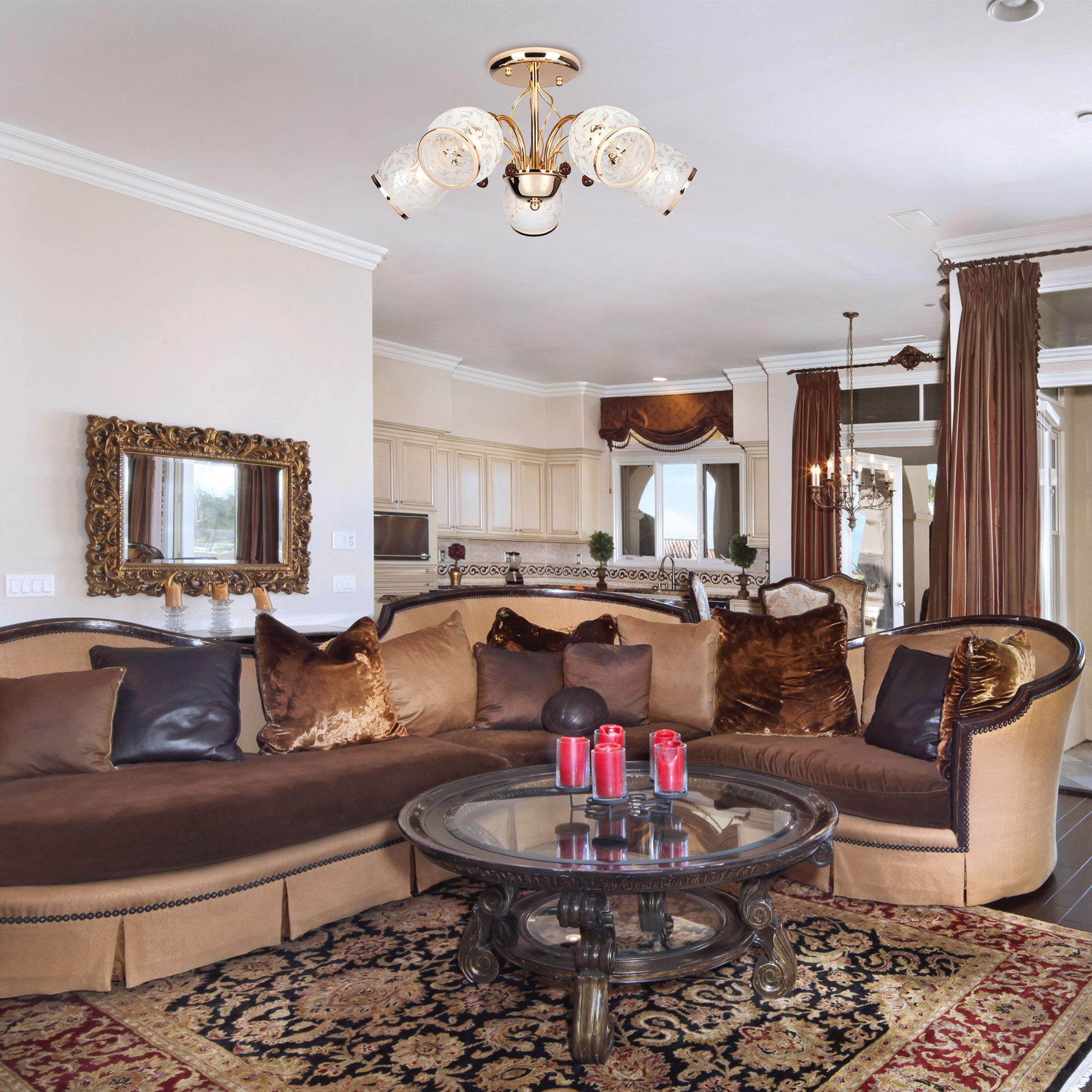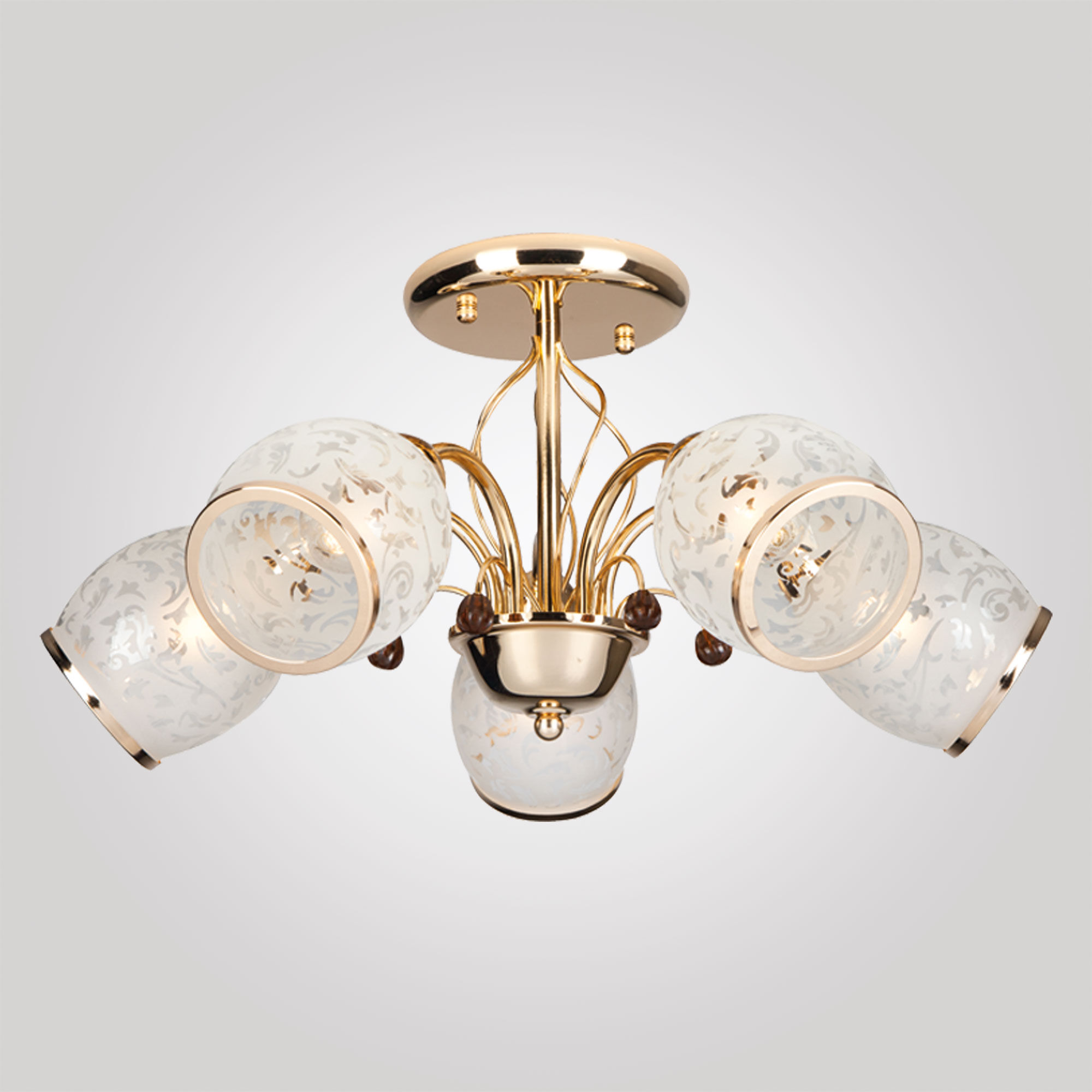 Потолочная люстра со стеклянными плафонами 30026/5 золото украсит вашу комнату и создаст качественное основное освещение на площади 24 м². Европейский дизайн в классическом стиле будет уместно смотреться в любом интерьере и подчеркнет утонченность вашего выбора.