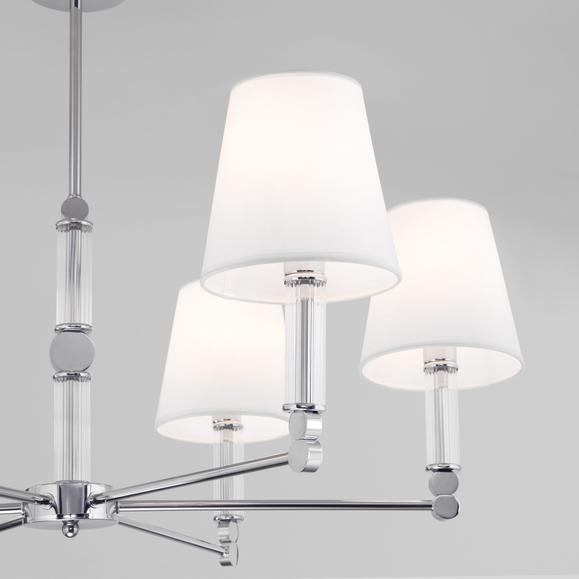 Элегантная люстра Conso соединяет в себе изысканный прованс и аристократичность. В дизайне потолочного светильника использованы восемь изящных тканевых абажуров, дающих мягкое рассеянное свечение, и утонченный декор арматуры цвета хром. Основания плафонов украшают вставки из прозрачного стекла. В модели используются сменные лампы с цоколем E27. Классический потолочный светильник Conso не только наполнит пространство светом, но добавит в интерьер умеренную торжественность.