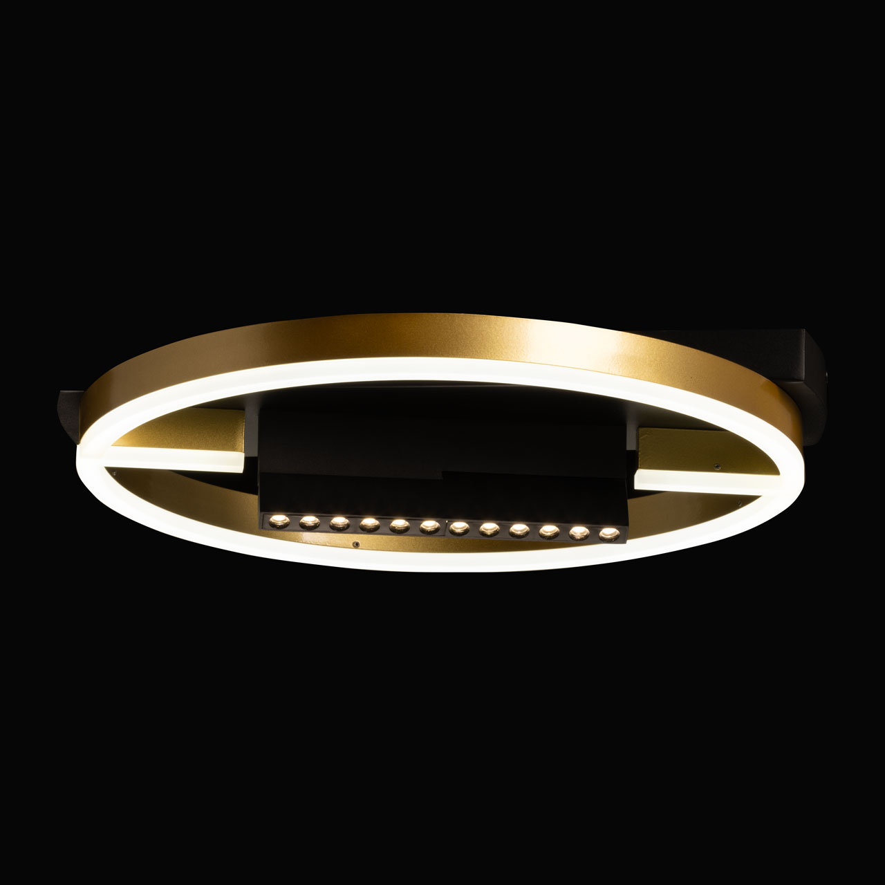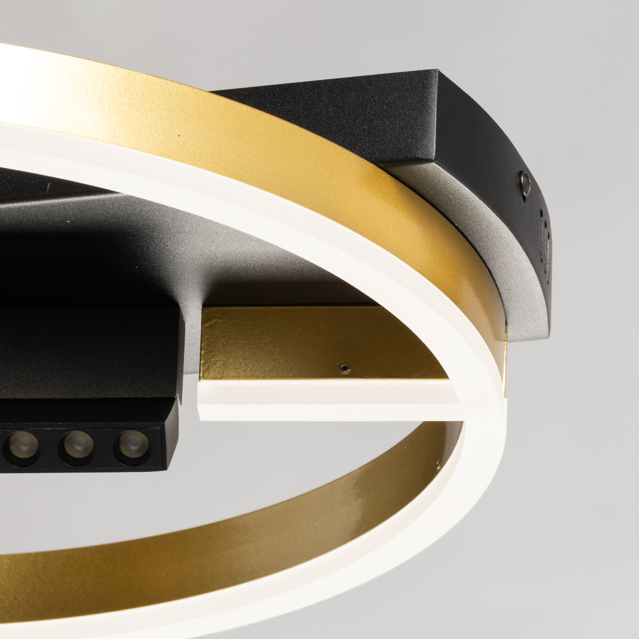 Металлическое основание потолочной люстры окрашено в черный цвет. Корпус плафона декоративного освещения выполнен из сплава алюминия с цинком и окрашен в цвет матового золота. Светодиодные источники света закрыты матовым акрилом. Плафон функционального освещения окрашен в цвет основания, Точечные направленные светодиоды углублены в корпус и ничем не закрыты.