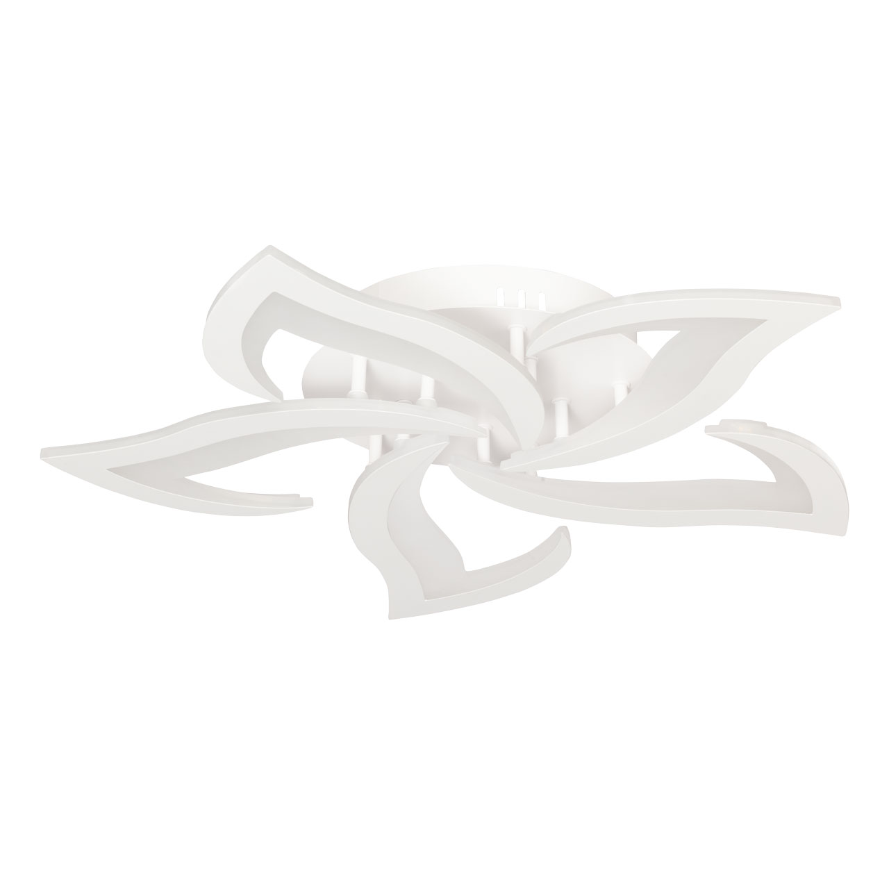 Металлическое основание потолочной люстры окрашено в белый цвет. Корпус плафона выполнен из сплава алюминия с цинком и окрашен в цвет основания. Светодиодный источник света закрыт матовым акрилом.
