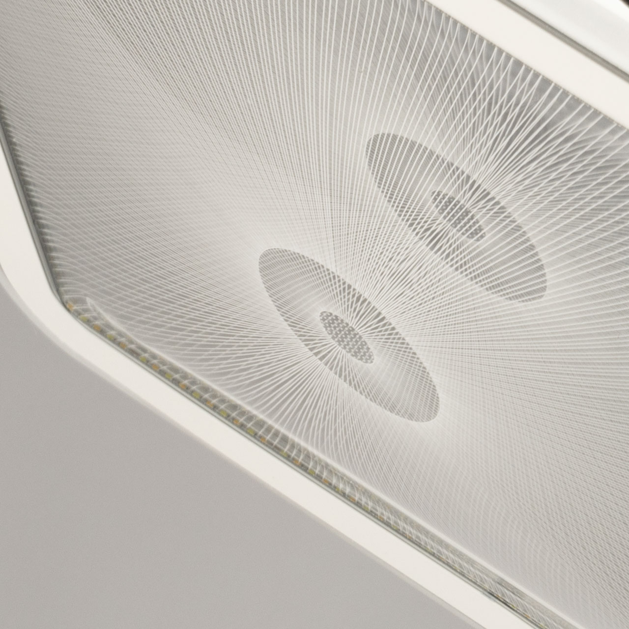 Металлическое основание светильника окрашено в белый цвет. Плафон выполнен из сплава алюминия с цинком и окрашен в цвет серебра. Светодиодные источники света закрыты белым матовым акрилом. Потолочная люстра декорирована металлической пластиной, гальванизированной в цвет хрома и прозрачным акрилом с 3D-эффектом.