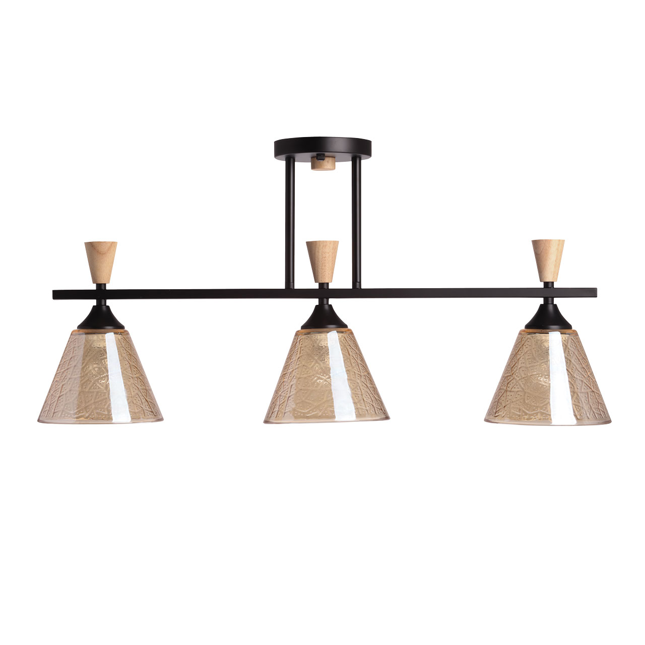 Металлическое основание потолочной люстры окрашено в черный цвет. Стеклянные плафоны отлиты в фактурную форму и гальванизированы в цвет коньяка. Потолочная люстра декорирована элементами из светлого натурального дерева.