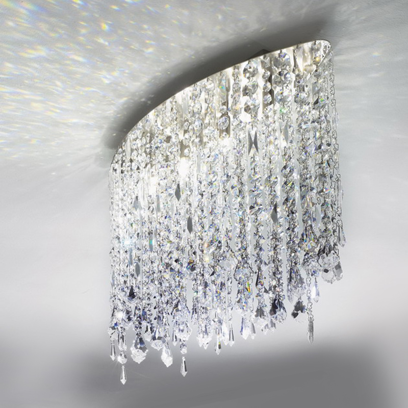 Подвесной светильник состоит из множества ниспадающих подвесок из хрусталя прозрачного цвета. Арматура выполнена из нержавеющей стали.