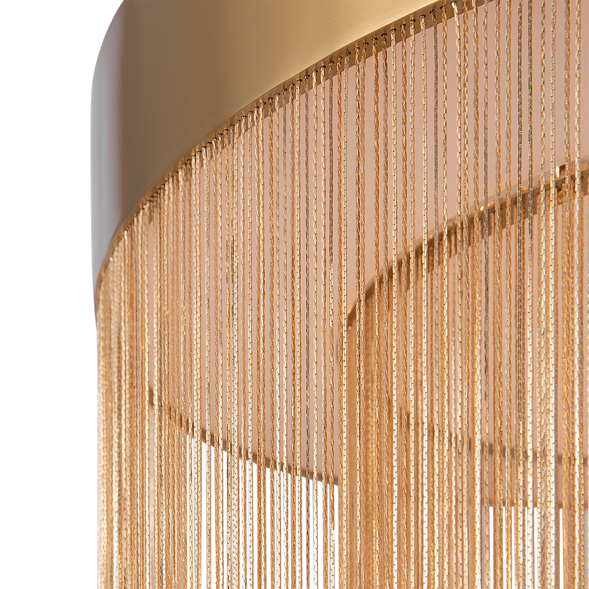 Металлическая арматура, цвет - золото. Мотивы ювелирного искусства в дизайне. Изящные цепочки на корпусе светильника создают переливы бликов. LED источник света. Цветовая температура - 3000К. Регулируемая высота подвесного светильника.