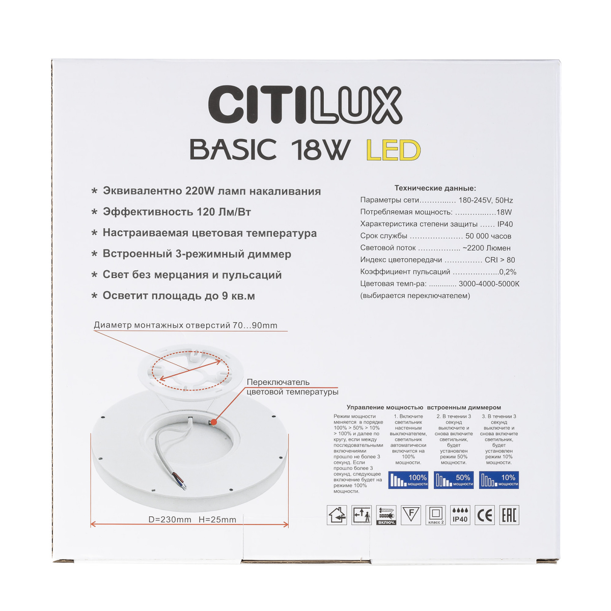 - Цветовая температура, K: 3000-4000-5000