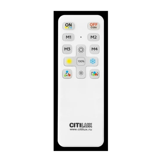 С помощью пульта доступно: плавная регулировка яркости от 10 до 100%; управление цветовой температурой от 3000К до 5500К позволяет настроить любые оттенки тёплого, нейтрального или холодного света. Цветная RGB подсветка имеет фиксированные и динамические режимы работы. Есть функция отсроченного выключения, 4 настраиваемых режима памяти, которыми также можно управлять настенным выключателем. Радиопульт ДУ в комплекте, работает на частоте 2,4ГГц. Питание пульта - 2 батарейки формата ААА, напряжением 1,5V (в комплект не входят).