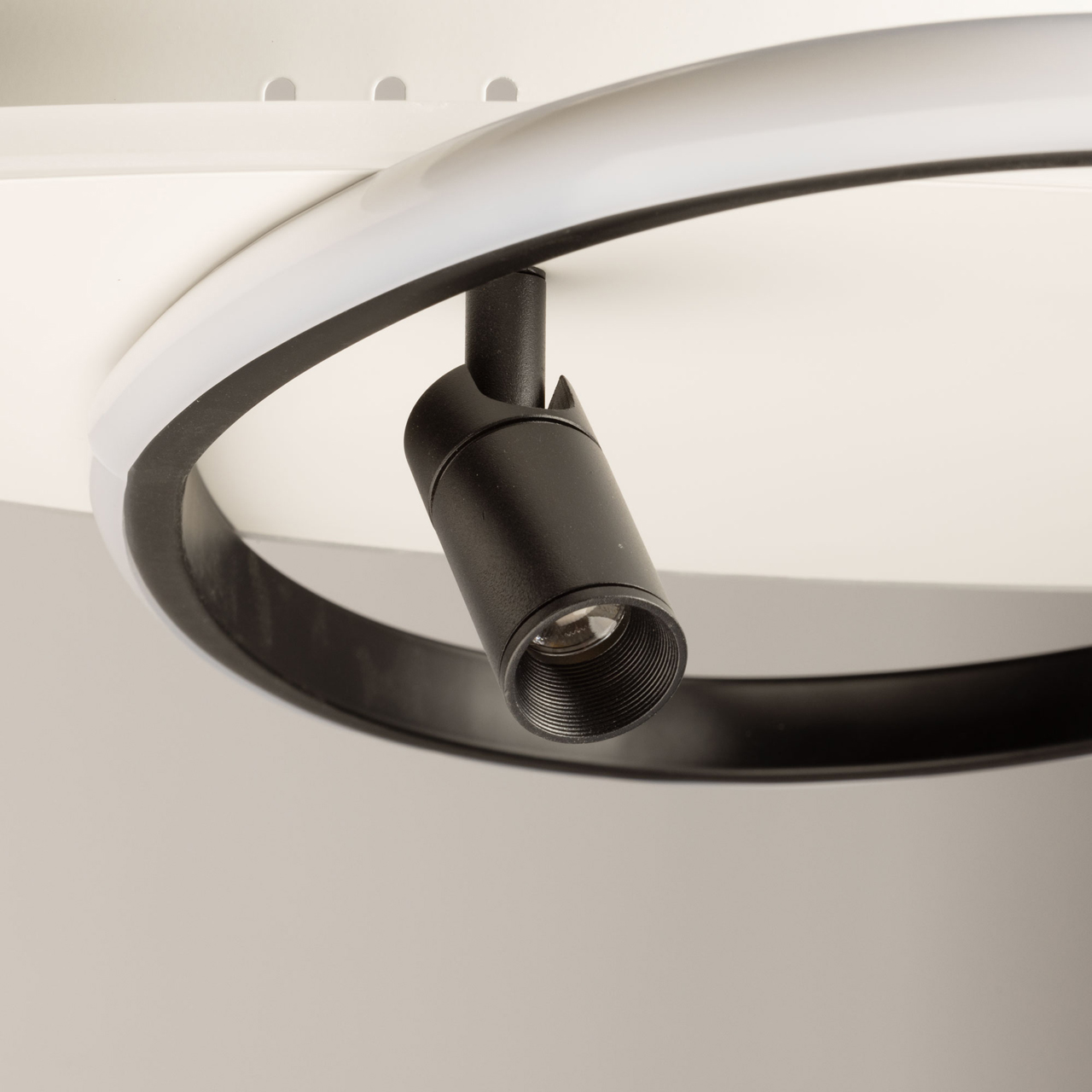 Металлическое основание потолочной люстры окрашено в белый цвет. Корпус плафона выполнен из сплава алюминия с цинком и окрашен в черный цвет. Светодиодный источник света закрыт матовым акрилом.