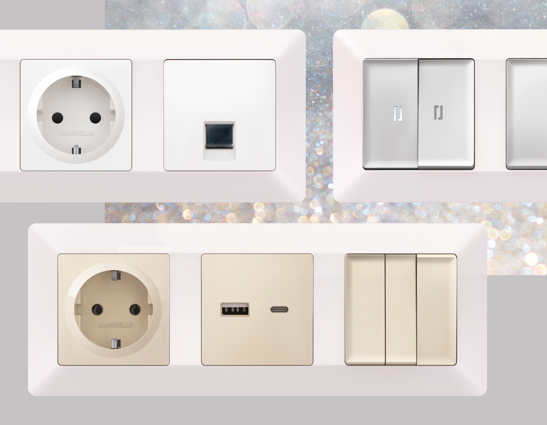 Многогранный ассортимент Ambrella Volt включает в себя механизмы, лицевые панели и рамки, а также комплекты, доступные в различных цветовых решениях. Продукция представлена в модульном исполнении, что позволяет гибко настраивать внешнийвид и функциональность. Вам будет легко заменить лицевую панель, рамку или механизм, найдя идеальное сочетание цветов.