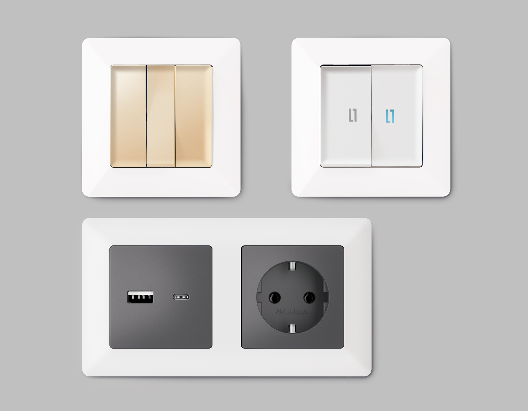 Многогранный ассортимент Ambrella Volt включает в себя механизмы, лицевые панели и рамки, а также комплекты, доступные в различных цветовых решениях. Продукция представлена в модульном исполнении, что позволяет гибко настраивать внешнийвид и функциональность. Вам будет легко заменить лицевую панель, рамку или механизм, найдя идеальное сочетание цветов.