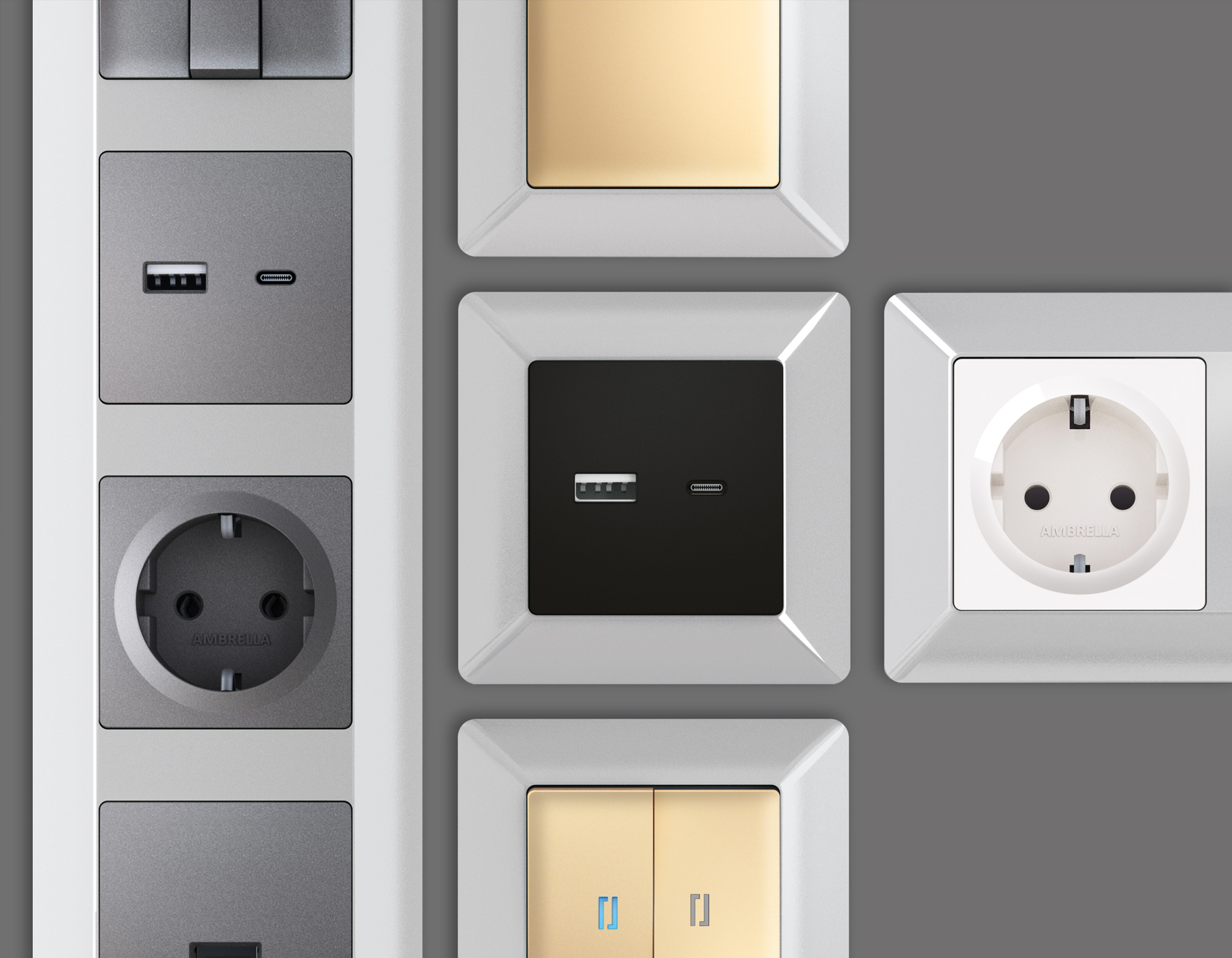 Многогранный ассортимент Ambrella Volt включает в себя механизмы, лицевые панели и рамки, а также комплекты, доступные в различных цветовых решениях. Продукция представлена в модульном исполнении, что позволяет гибко настраивать внешнийвид и функциональность. Вам будет легко заменить лицевую панель, рамку или механизм, найдя идеальное сочетание цветов.