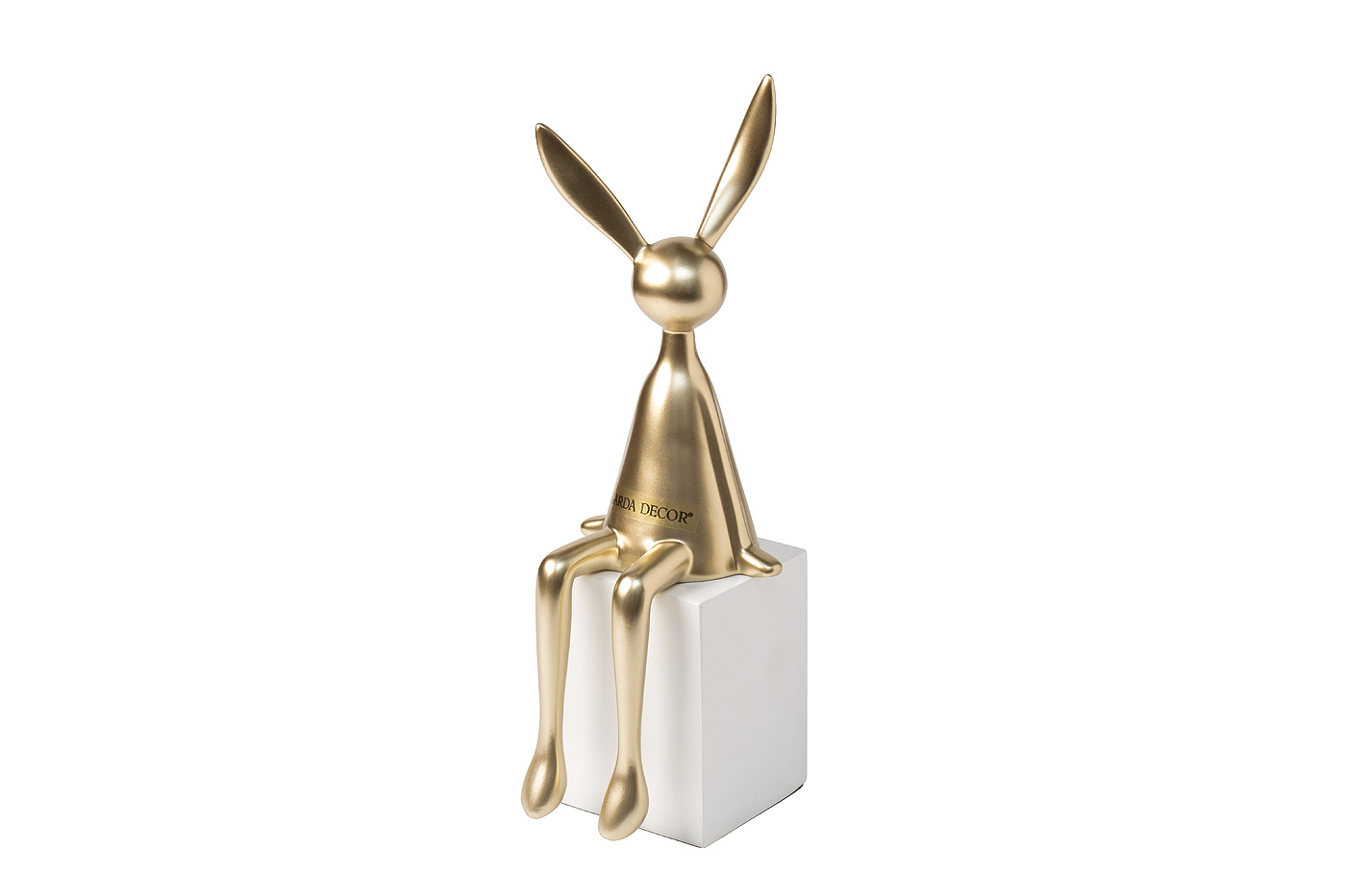 Абстрактная форма и игра контрастов – статуэтка кролика переосмысляет традиционный декор, превращаясь в арт-объект. Скульптурная статуэтка золотого цвета, расположенная на строгом белом кубе, создает баланс между игривостью и архитектурной четкостью, идеально вписываясь в минимализм, модерн или концептуальный интерьер. Этот объект идеален для обстановок с акцентом на арт-дизайн, добавляя пространству тонкую аллюзию на скульптуры модернизма и эстетические коды галерейного искусства.