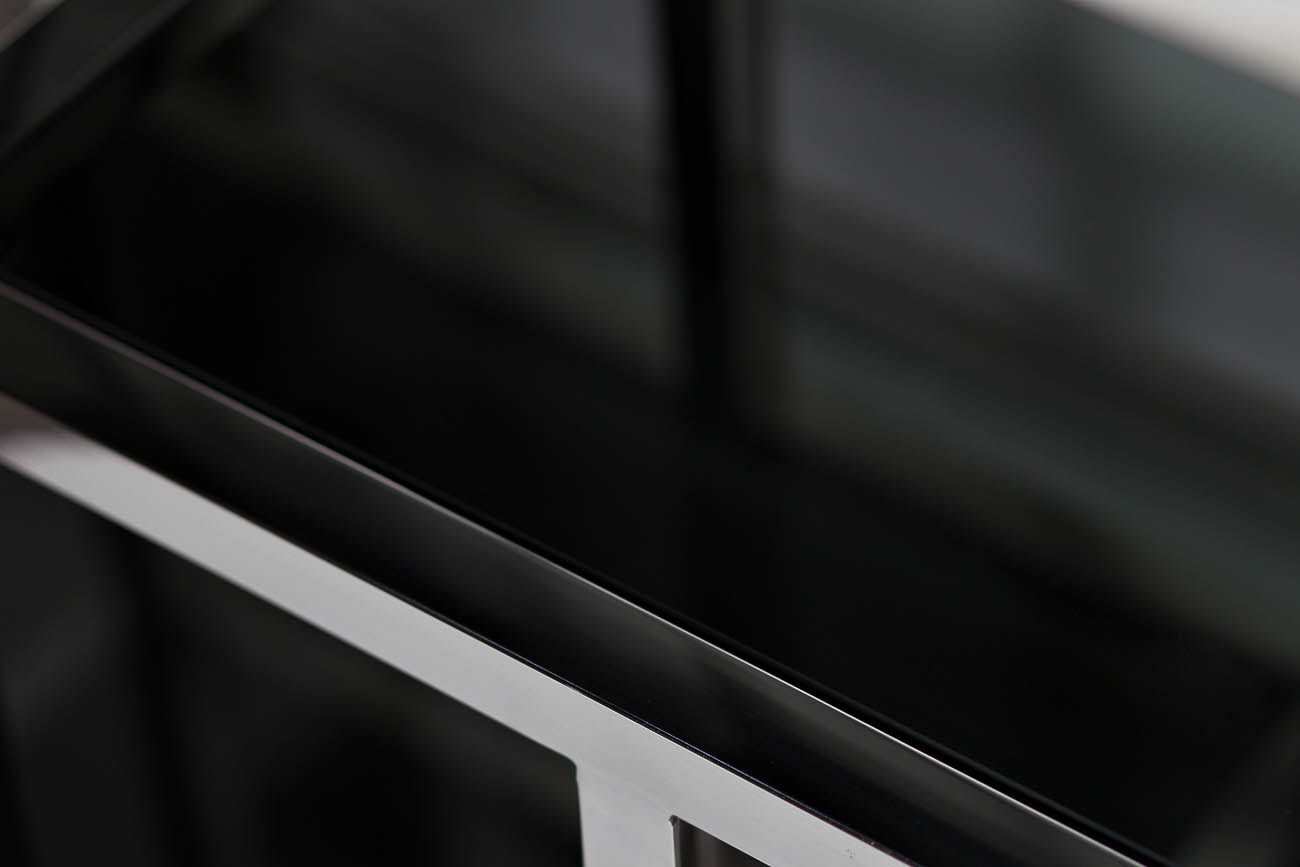 Самые модные тенденции европейского интерьерного дизайна воплотились в роскошном стеллаже серебристой стали с полками из закаленного черного стекла. Статуэтки, книги и вазы, размещенные на полках в произвольном порядке, сразу превращают стеллаж в изысканный арт-объект. Дополните интерьер зеркалами и нетривиальным освещением, и ваша комната будет выглядеть как с обложки дизайнерского журнала.