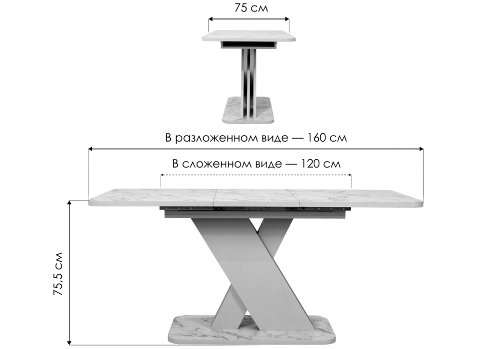 Материал каркаса - ЛДСП; Материал столешницы - Ламинат; Ширина - 75; Высота - 75,5; Длина стола в разложенном виде - 160; Длина - 120;