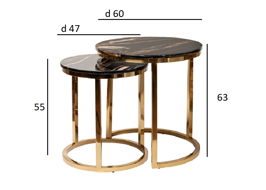 Стильный комплект журнальных столиков станет отличным выбором для гостиной, кабинета, спальни. Конструкция модели весьма интересная – два журнальных столика различны по размерам, поэтому меньший легко задвигается и экономит пространство. При необходимости вы получаете сразу два стола, а значит в два раза больше места для сервировки. Дизайнерский набор журнальных столиков выглядит элегантно и презентабельно за счет сочетания столешниц под мрамор с каркасом из нержавеющей стали золотого цвета. Размеры столов - 60х60х63, 47х47х55 Комплект столов в таком же дизайне, но в большем размере - арт. 57EL-CT101А-BL.