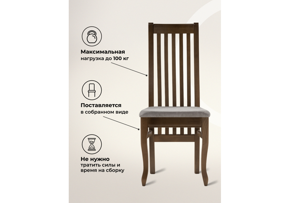 Материал каркаса - массив дерева; Материал сиденья - ткань; Материал обивки - ткань; Ширина - 45; Глубина - 55; Высота - 102; Ширина сиденья - 42; Глубина сиденья - 44; Высота сиденья - 46;