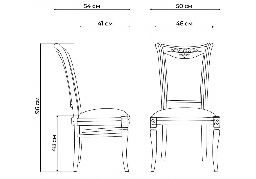 Материал каркаса - массив дерева; Материал сиденья - ткань; Материал обивки - ткань; Ширина - 50; Глубина - 54; Высота - 96; Ширина сиденья - 46; Глубина сиденья - 41; Высота сиденья - 48;