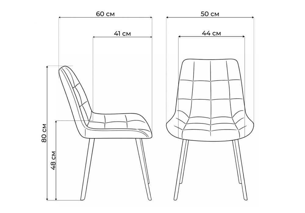 Материал каркаса - металл; Материал сиденья - велюр; Материал обивки - велюр; Цвет ножек - черный; Ширина - 50; Глубина - 60; Высота - 80; Ширина сиденья - 44; Глубина сиденья - 41; Высота сиденья - 48;