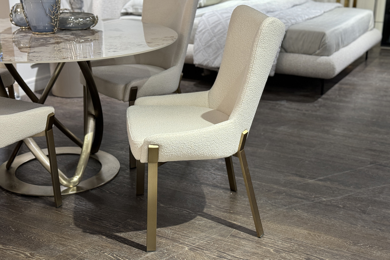 Стул обеденный в обивке из белого букле — элегантное решение для современной столовой или обеденной зоны. Этот обеденный стул из букле привлекает мягкой, тактильно приятной обивкой белого оттенка, которая добавляет интерьеру света и ощущения уюта. Тонкие металлические ножки в бронзовой отделке подчёркивают изящный силуэт и придают модели благородный акцент. Дизайнерский обеденный стул букле гармонично вписывается в интерьеры в стиле modern luxury, современная классика и soft minimalism, создавая комфортную и визуально сбалансированную обстановку. Размеры сиденья: ширина - 47см, глубина - 47см, высота - 47см.