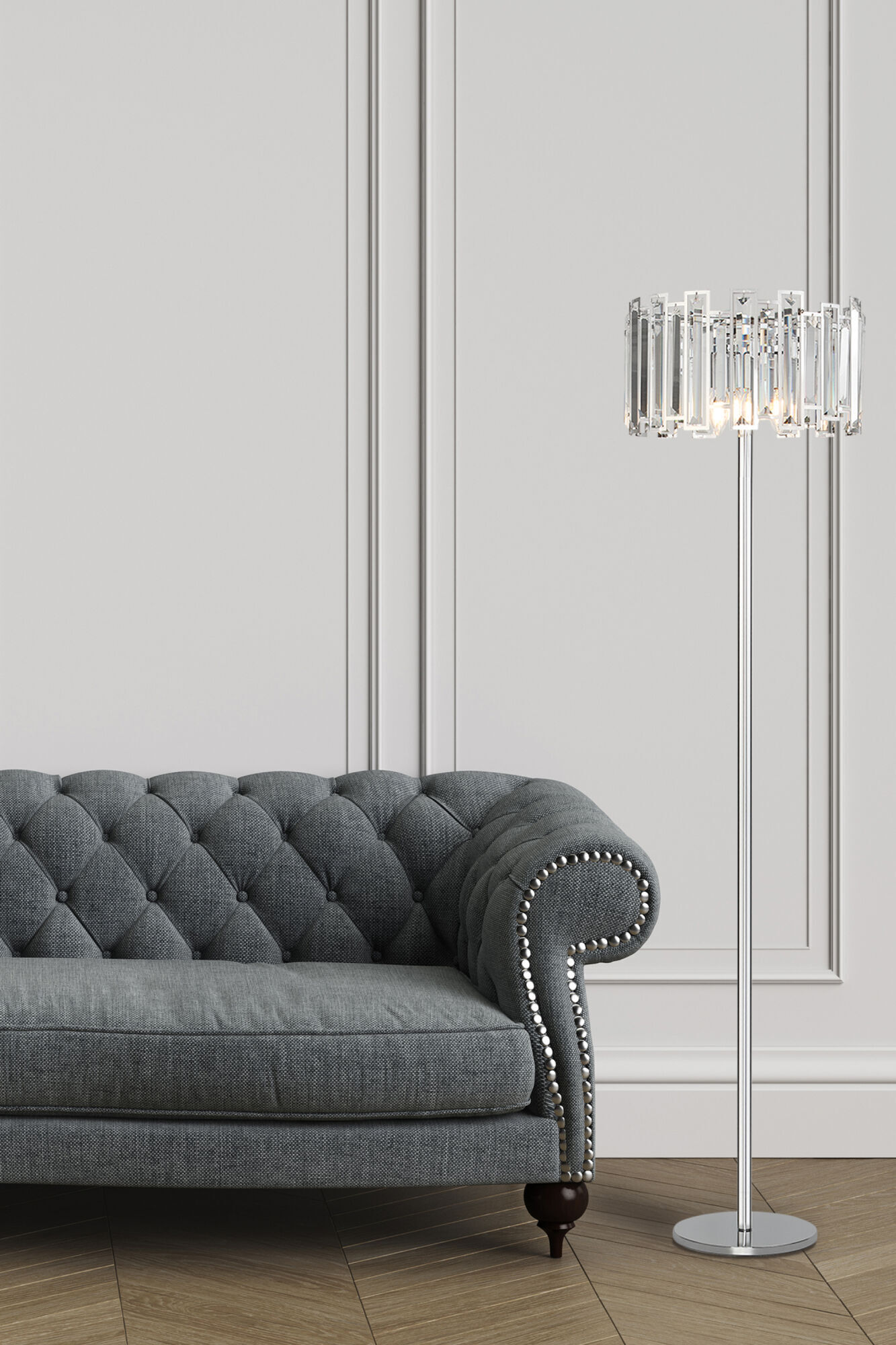 Торшер с хрусталем хром 01149/3 Strotskis - это стильный элемент светового дизайна в современных и классических интерьерах. Выразительный и современный торшер со сменными лампами E14 поможет создать качественное дополнительное освещение на площади 5 м² и станет изящным украшением вашей комнаты.
