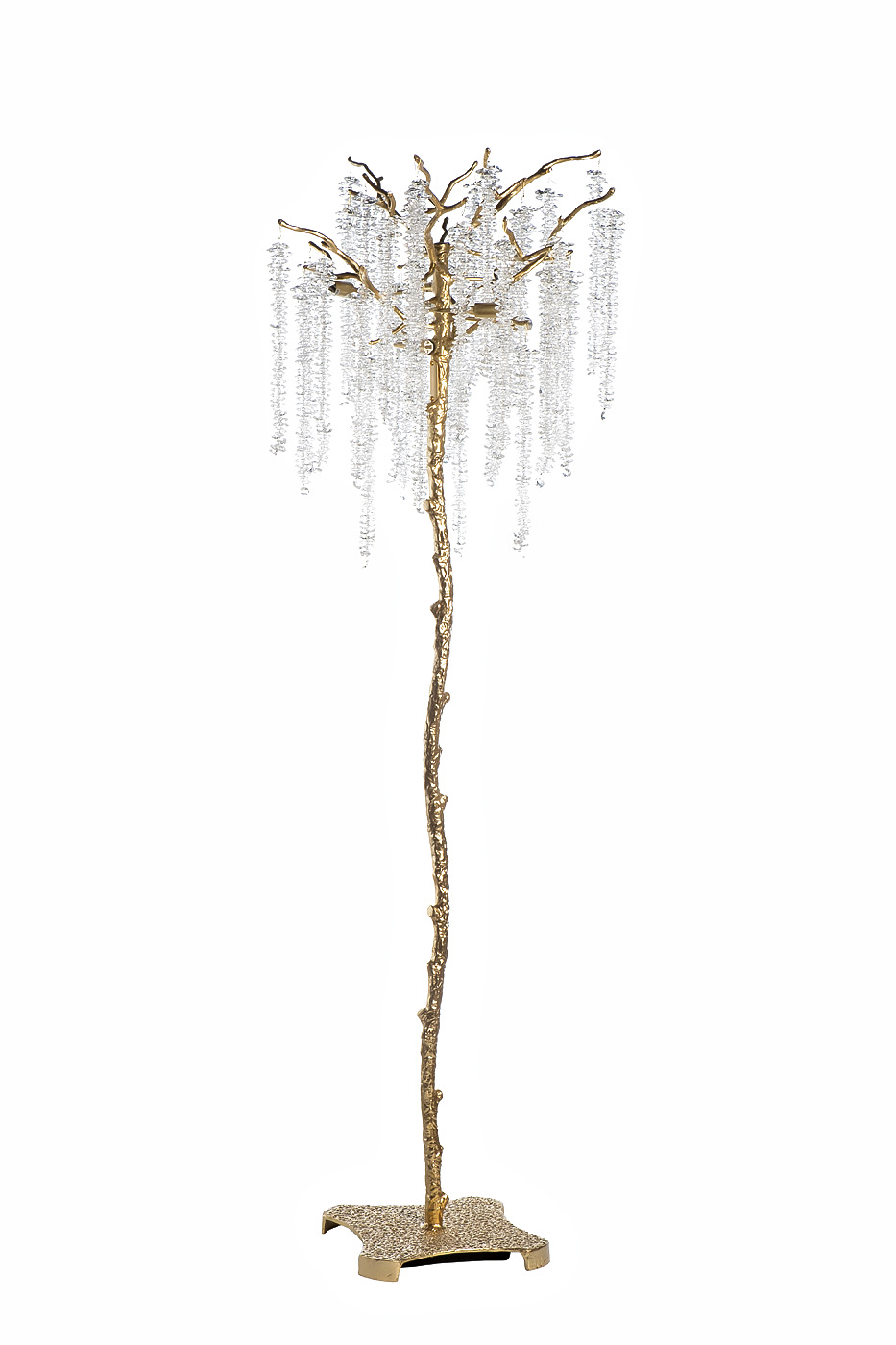 Дизайнерский торшер со стеклянными подвесами будет эффектно смотреться как в классических, так и в изысканных современных интерьерах. Это не только дополнительный источник света, но и роскошное украшение обстановки. Оригинальный дизайн напольного светильника представлен в виде дерева из металла, с «ветвей» которого ниспадают гроздья стеклянных подвесок. Декоративность торшера позволяет органично вписать его в стилистику ар-деко, неоклассика, модерн. Золотой блеск металла и перелив стеклянных элементов придают торшеру изысканности