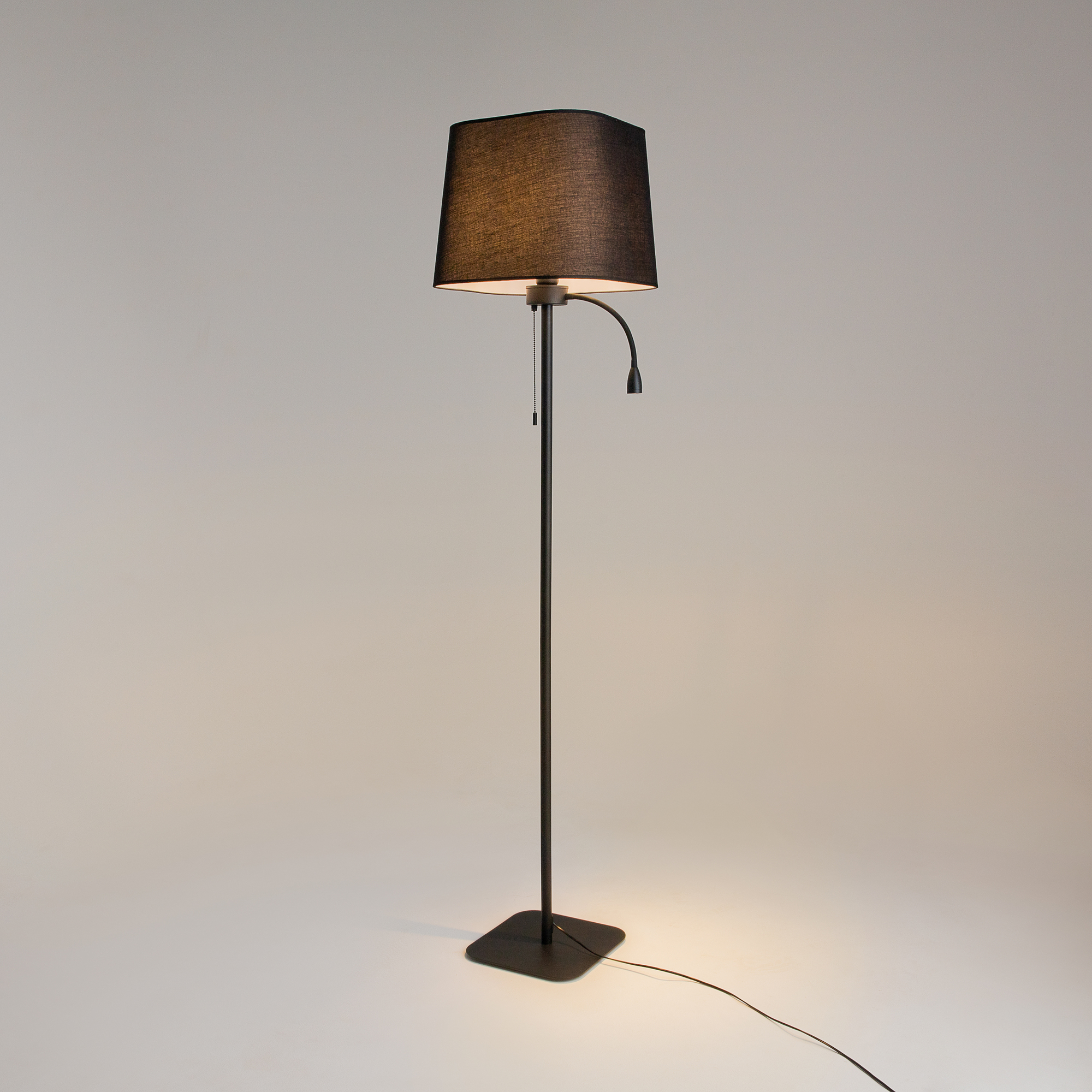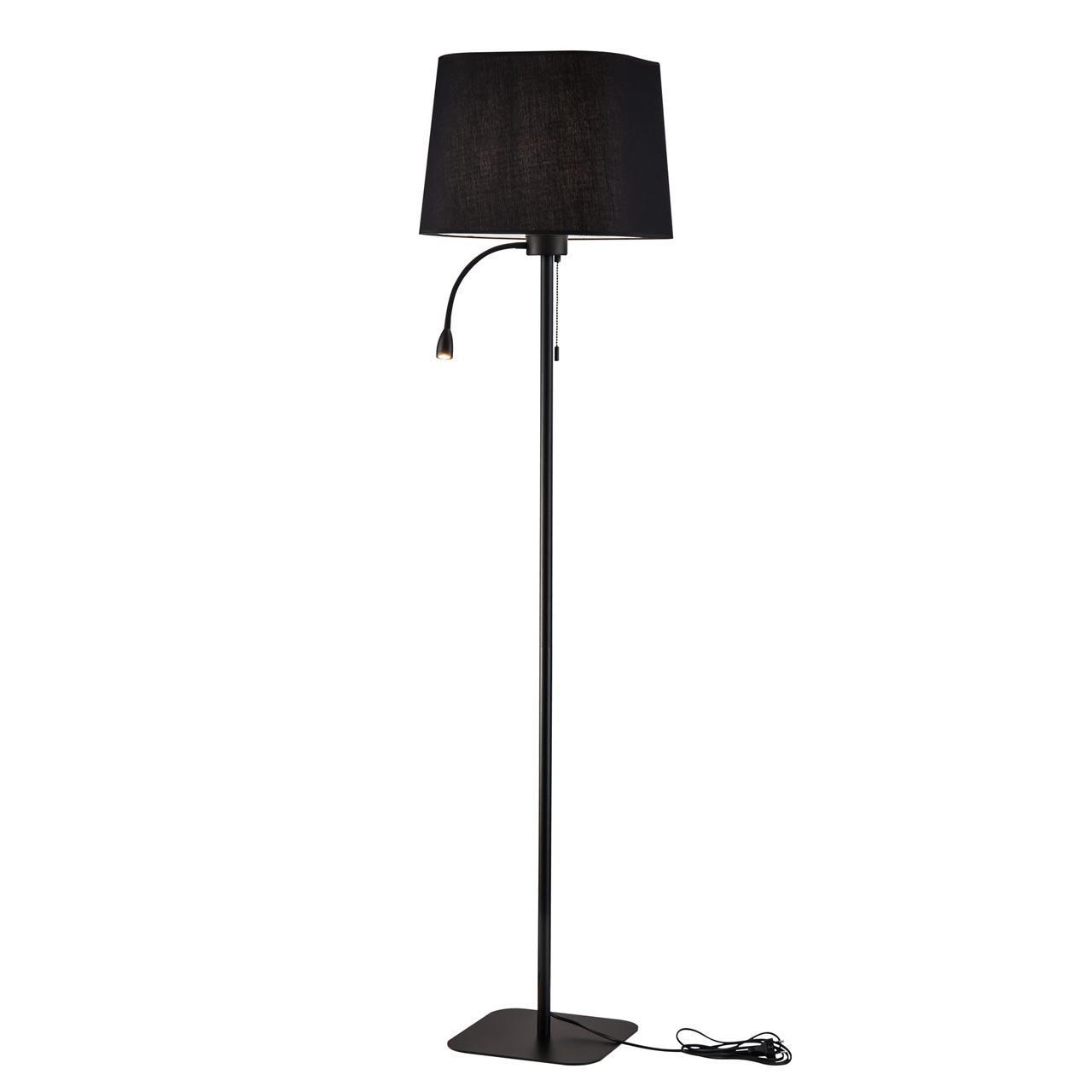 Оригинальная модель черного цвета произведена из металла. Плафон - пирамида, выполнен из ткани. Стиль торшера - современный, его можно использовать для спальни, создаст уютную атмосферу, может служить, как для декоративного освещения, так и для функционального освещения места для чтения книги, например.