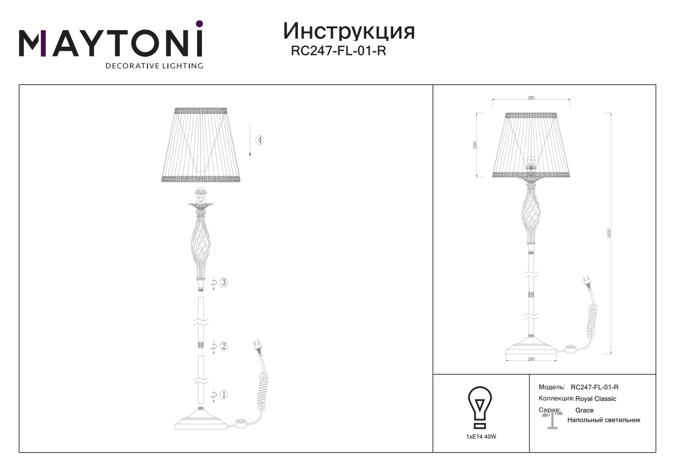 Напольный светильник Maytoni Grace RC247-FL-01-R отлично подойдёт для гостиной, спальни, кабинета и может служить, как для декоративного освещения, так и для функционального освещения места для чтения книги, например. Украсьте свое интерьерное пространство с помощью Maytoni Grace RC247-FL-01-R.